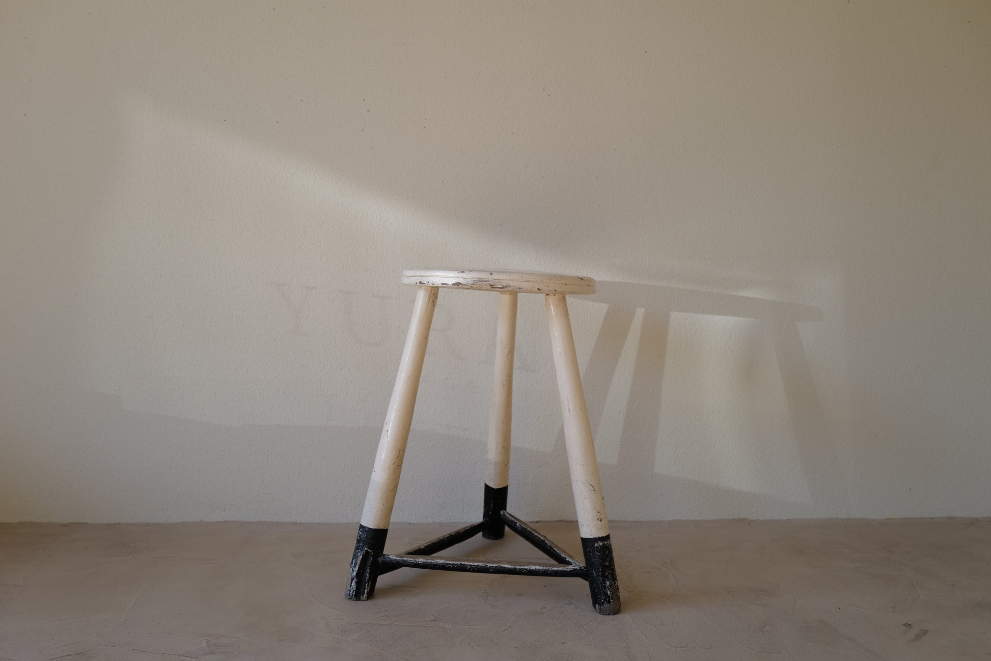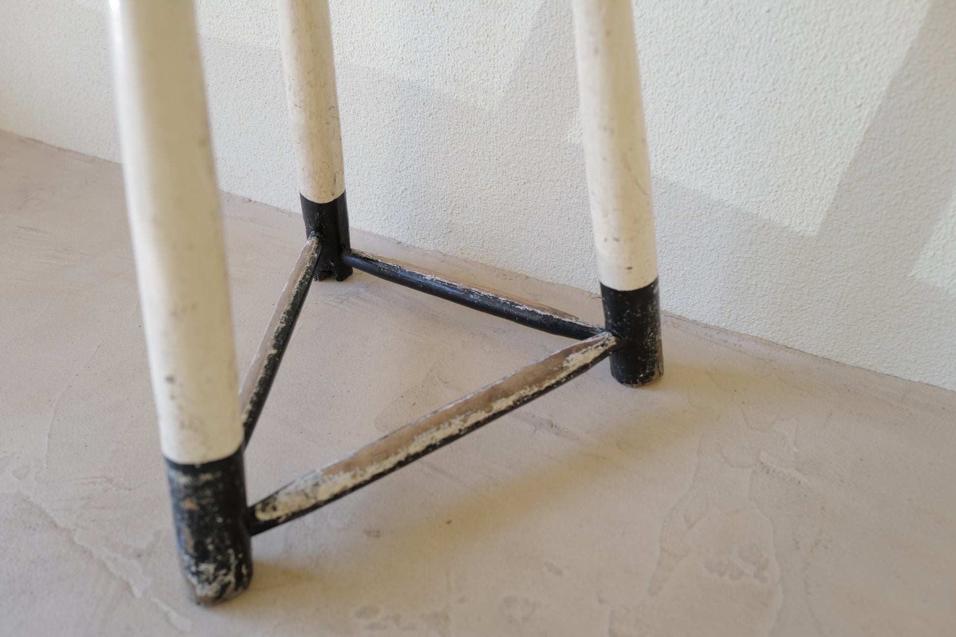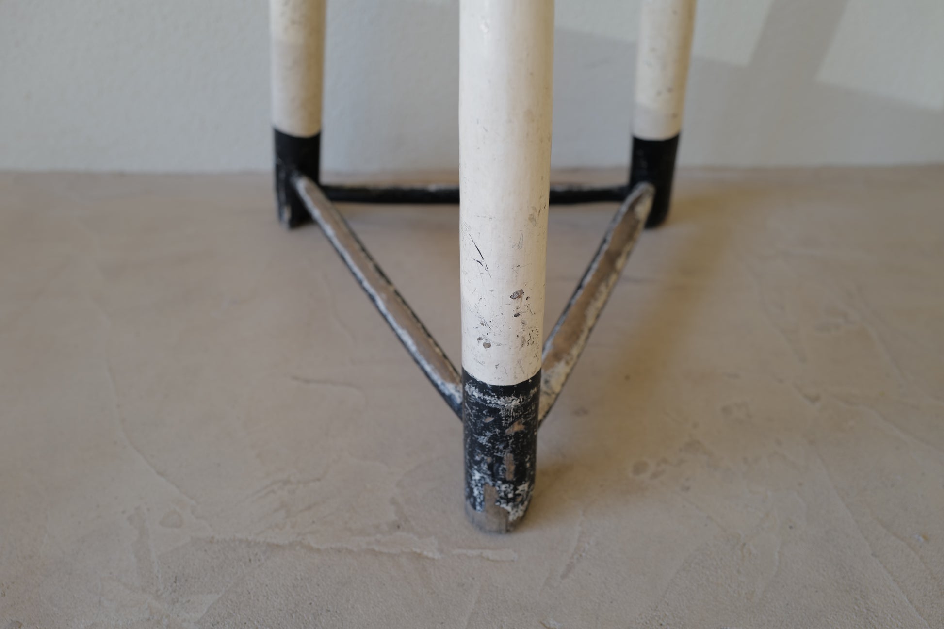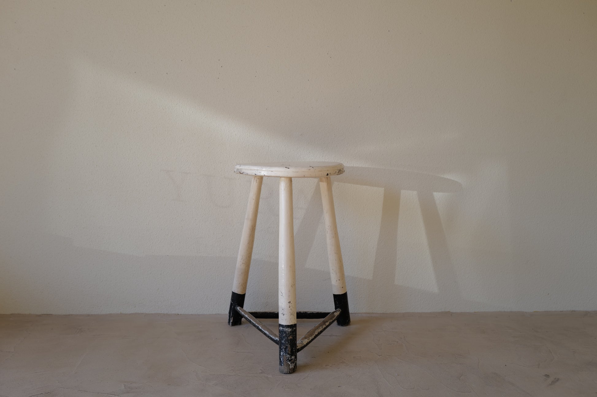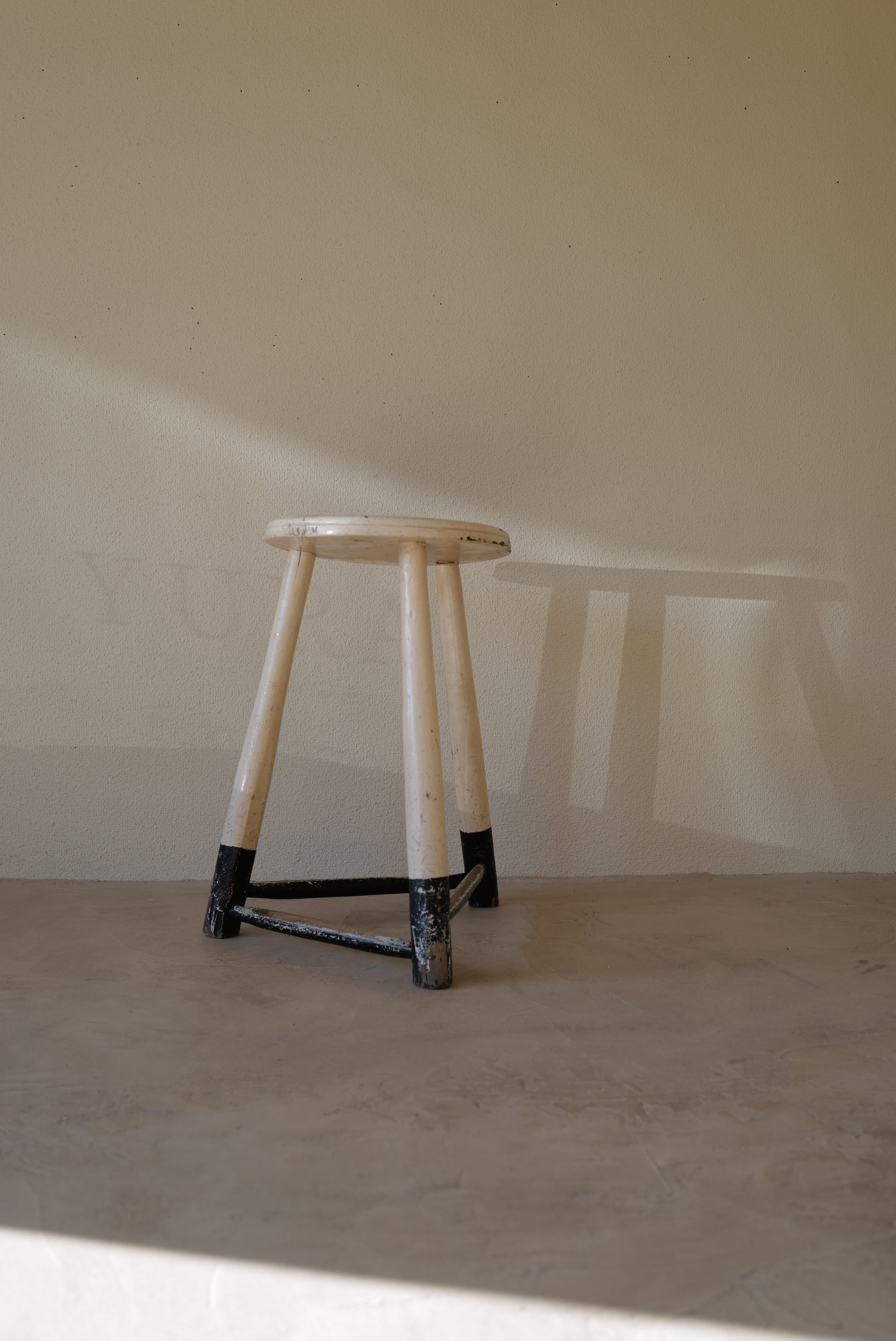 1950年代にヨーロッパで製造された木製のスツールになります。絶妙なバランスで塗られた黒と白のペイントに三脚足の補強材の微妙な組み方、当時の製作者の変なこだわりを感じるセンスの良いスツールになります。状態としては経年による劣化が良い風合いとお考えいただければ幸いです。