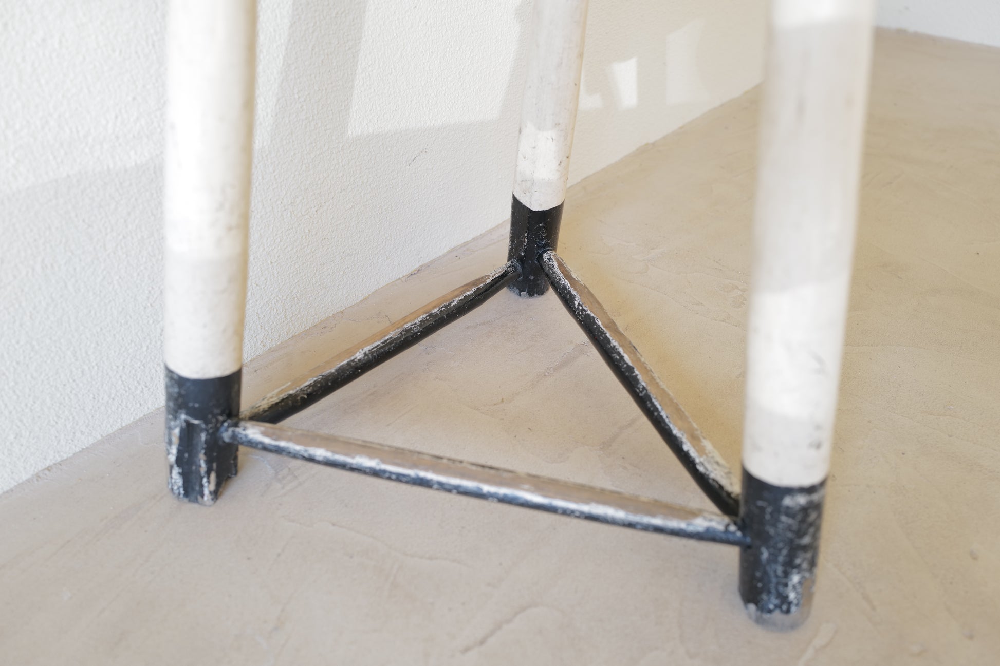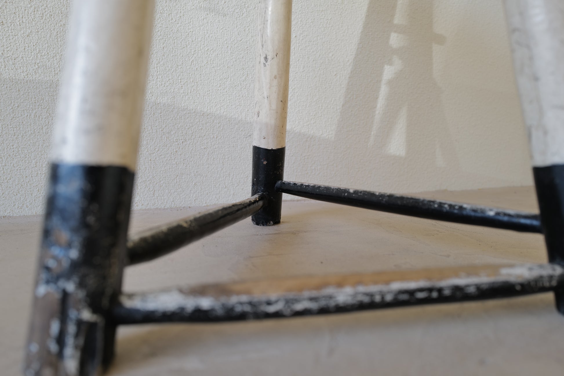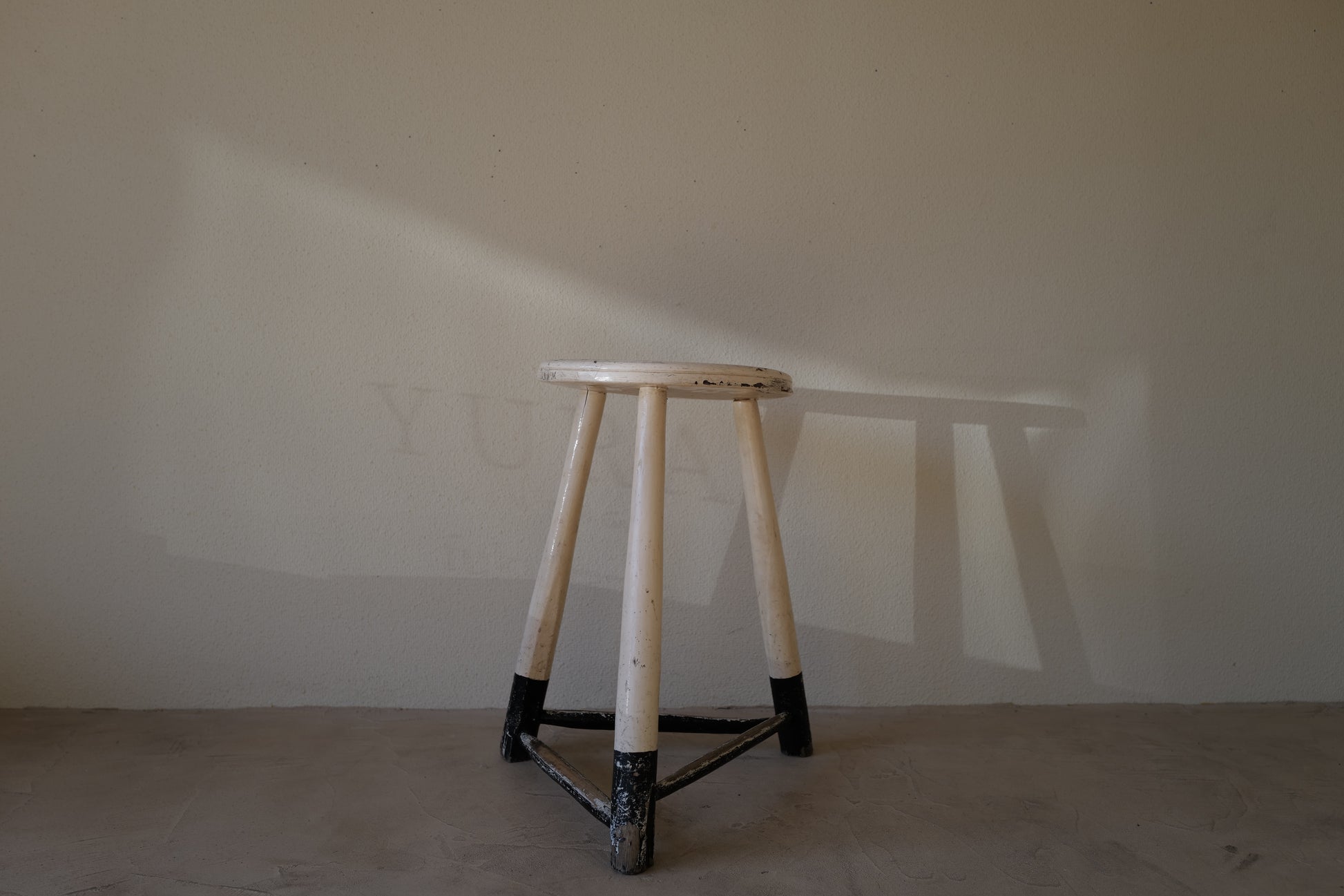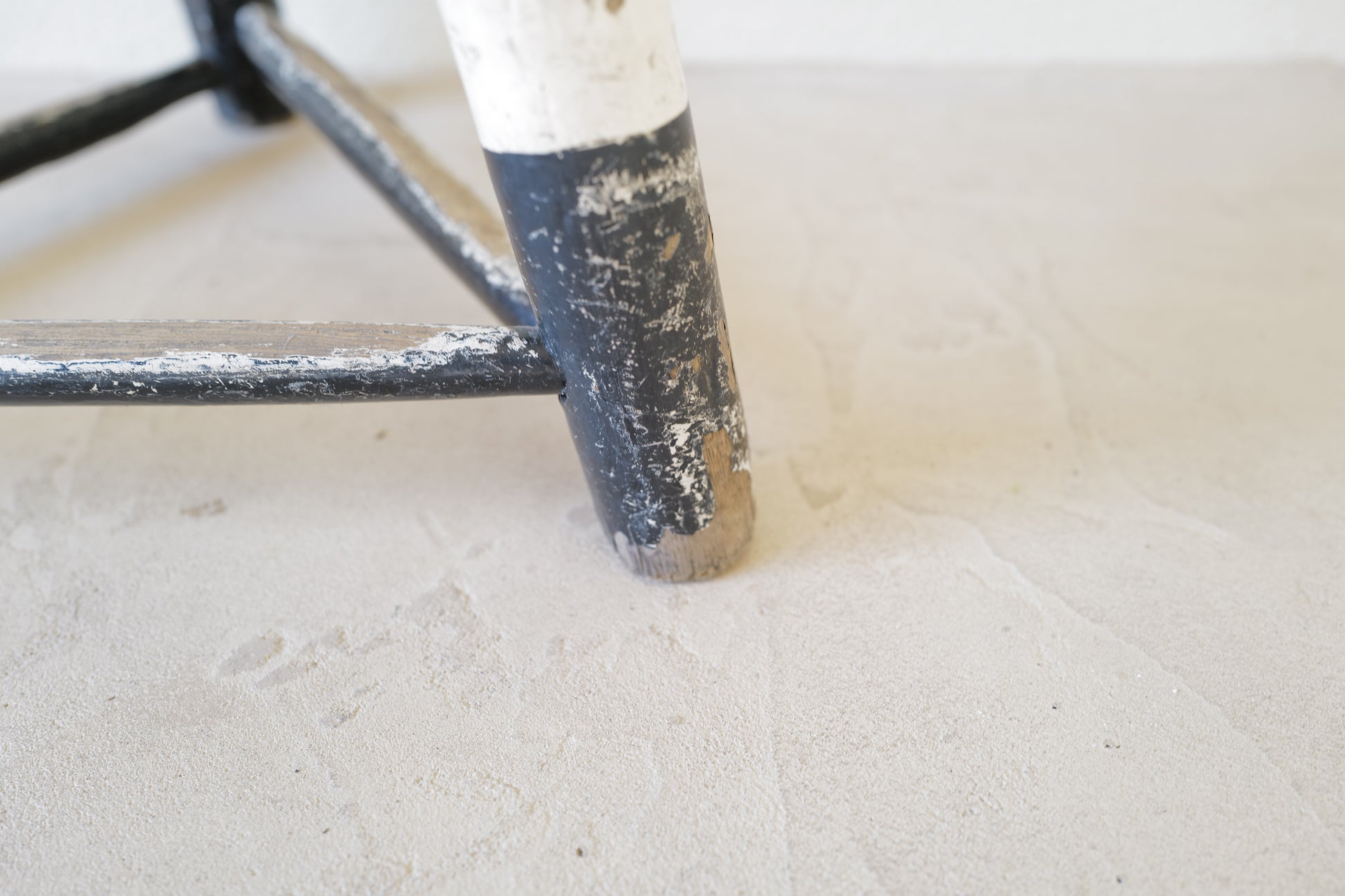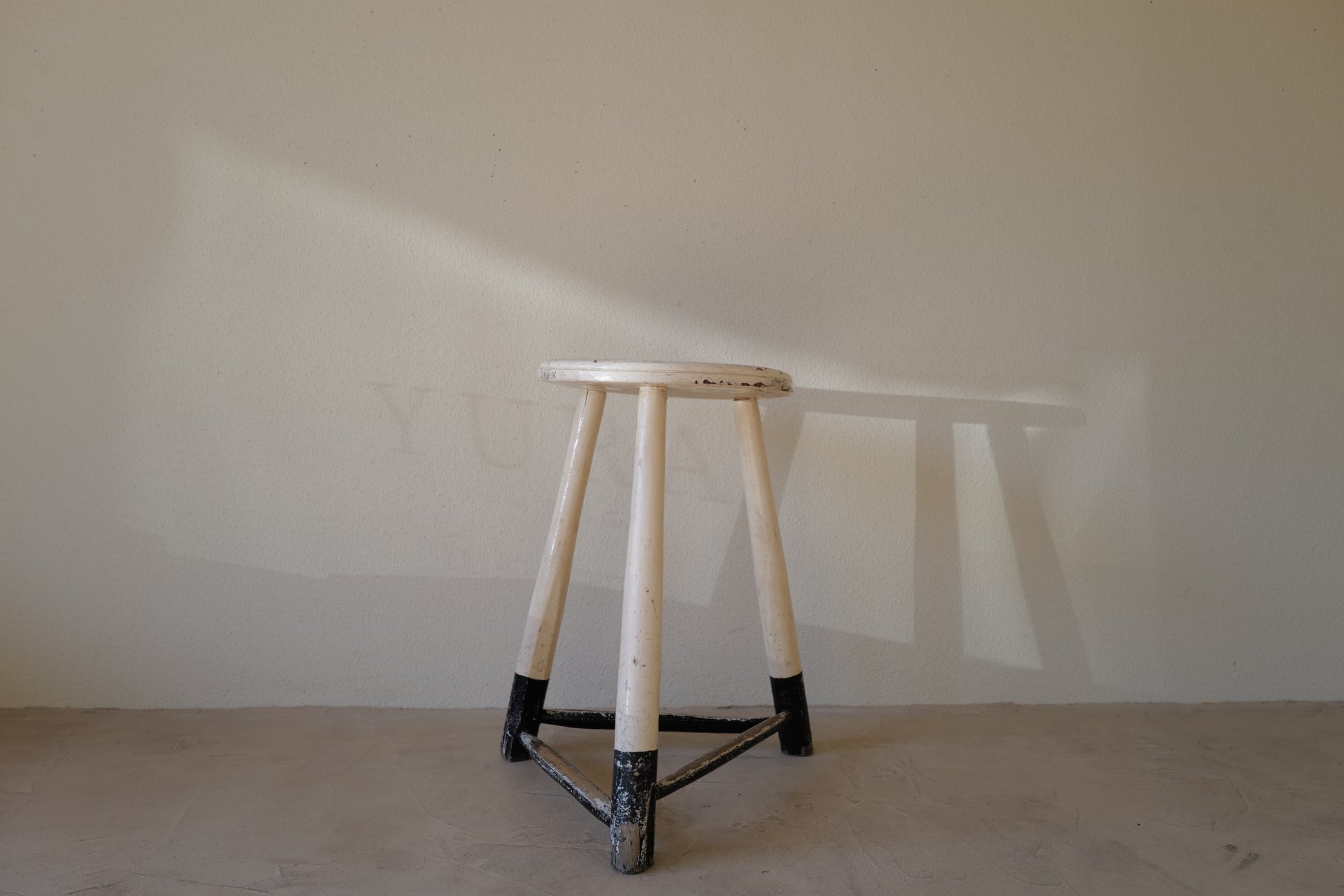 1950年代にヨーロッパで製造された木製のスツールになります。絶妙なバランスで塗られた黒と白のペイントに三脚足の補強材の微妙な組み方、当時の製作者の変なこだわりを感じるセンスの良いスツールになります。状態としては経年による劣化が良い風合いとお考えいただければ幸いです。