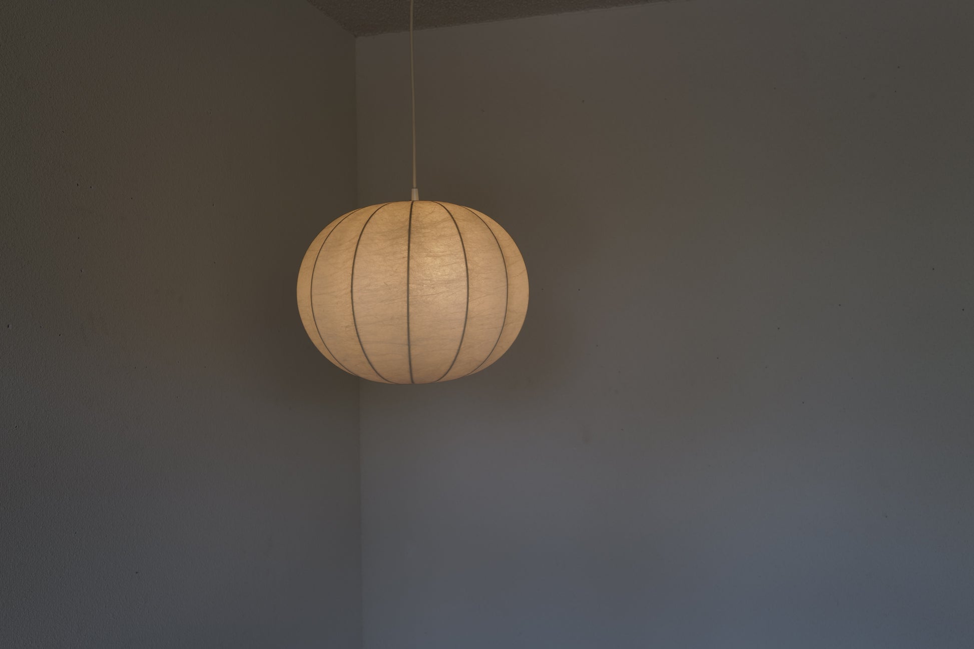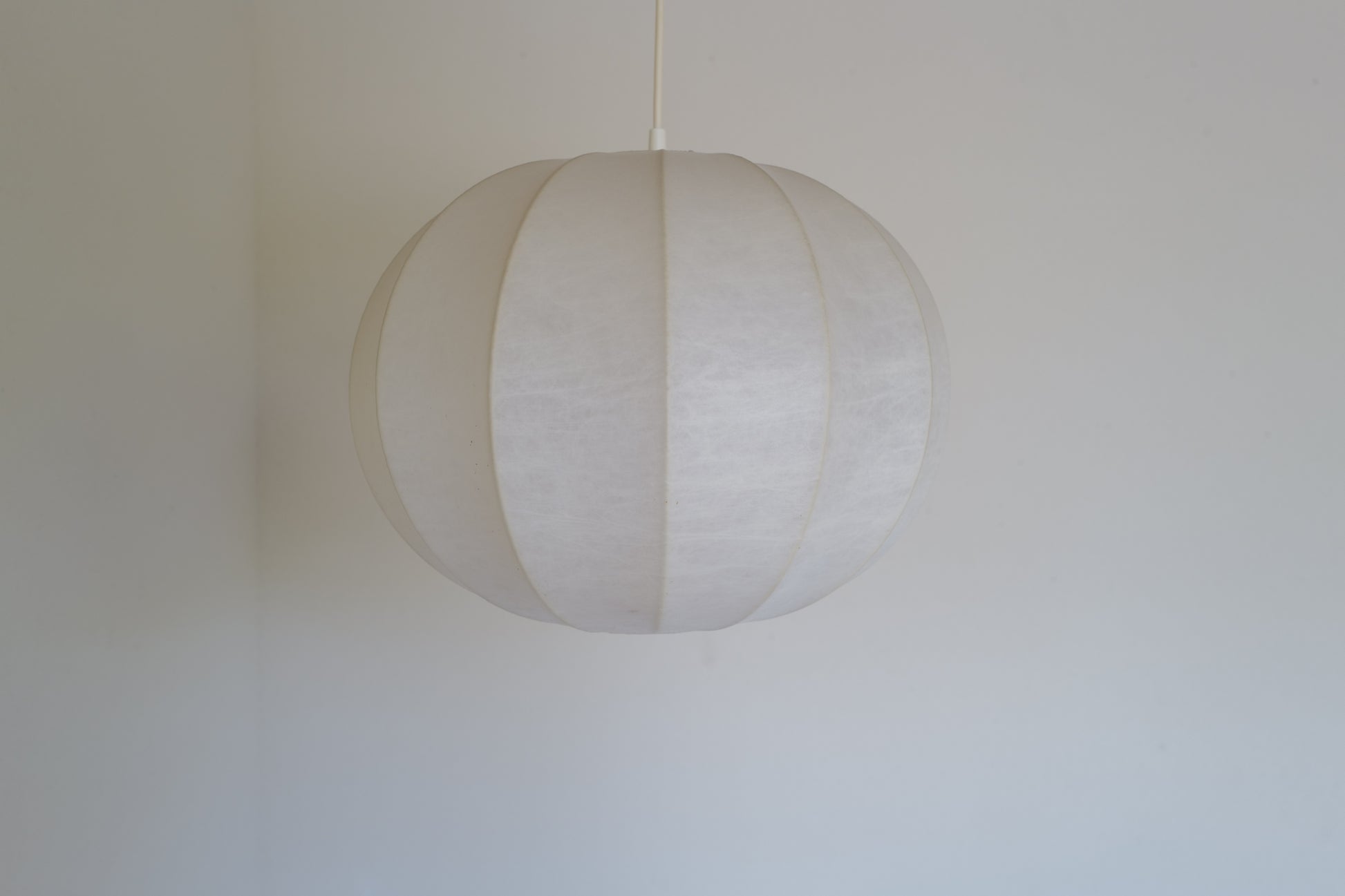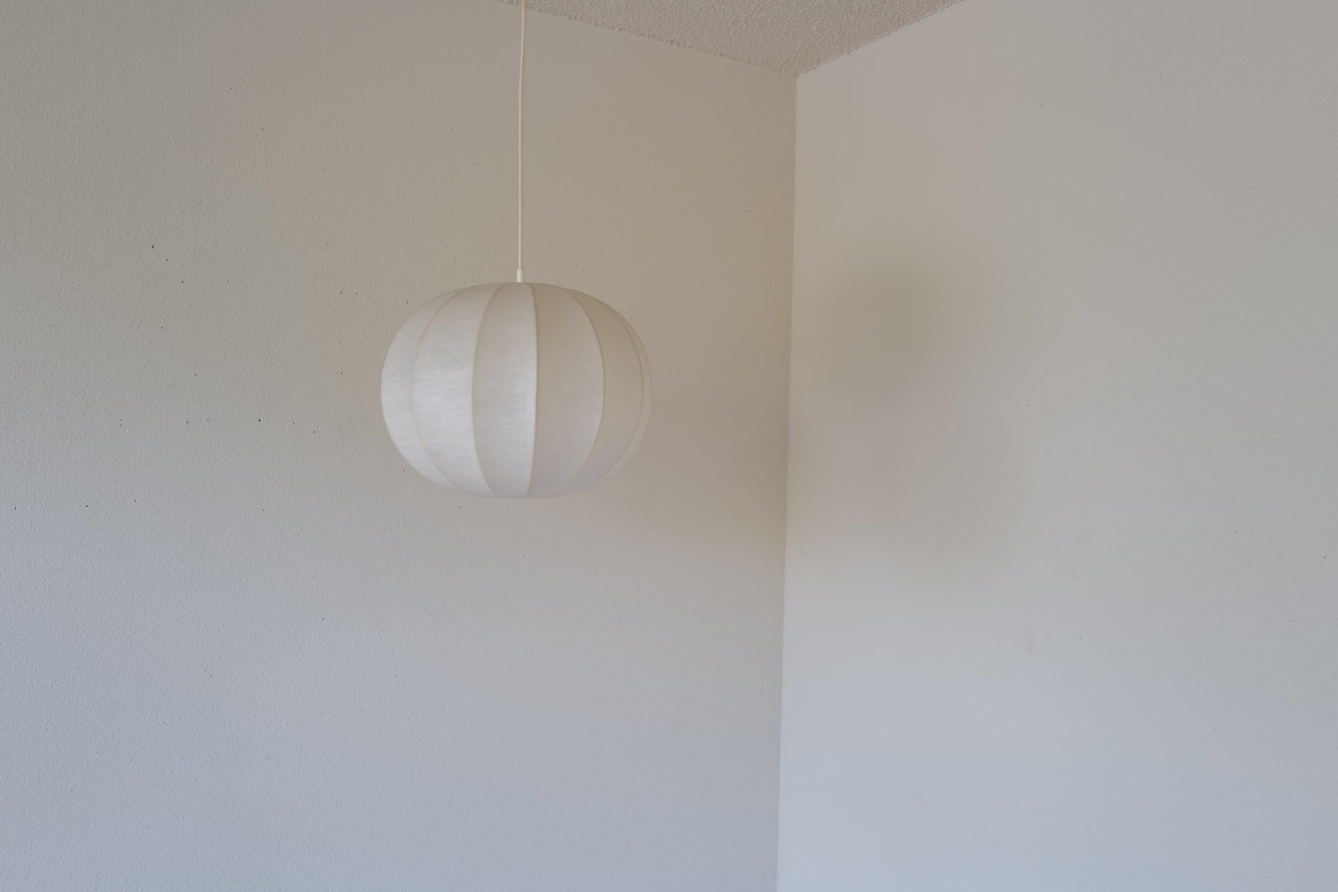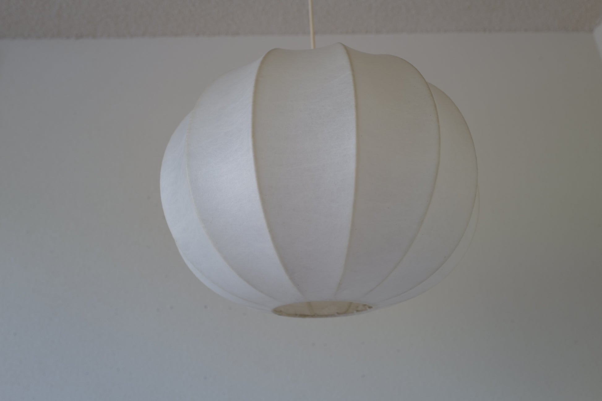 1960年代ドイツで製造されたコクーンランプ。和紙のような見た目ですが、また違った質感のコクーンシェイド。ワイヤーベースにプラスチック繊維を吹きかけたシェードはなんとも柔らかく、ぷっくりとした質感に可愛さが滲み出るとても面白い作品です。状態も60年以上前のもとは思えない程良い状態を保っております。