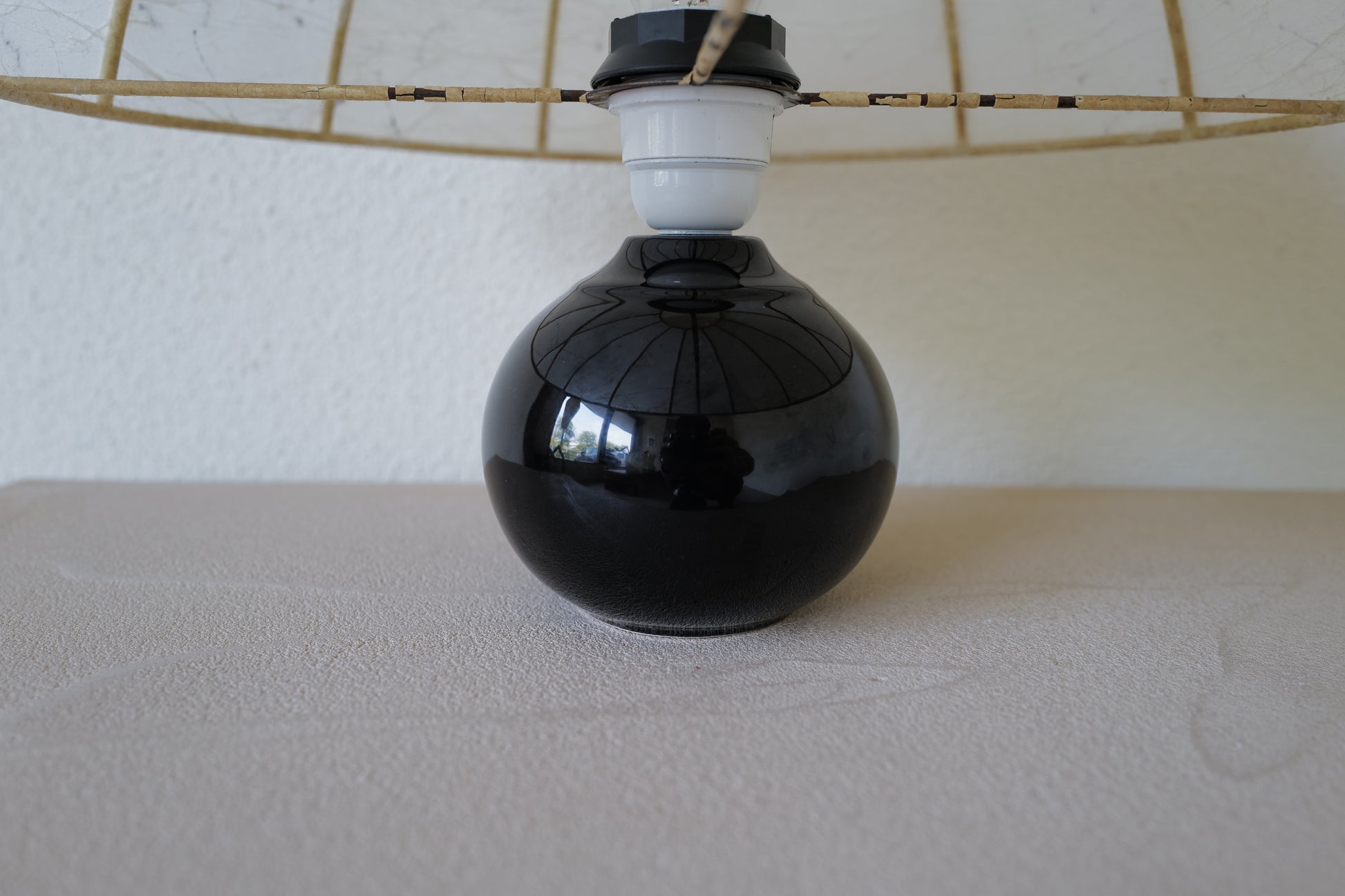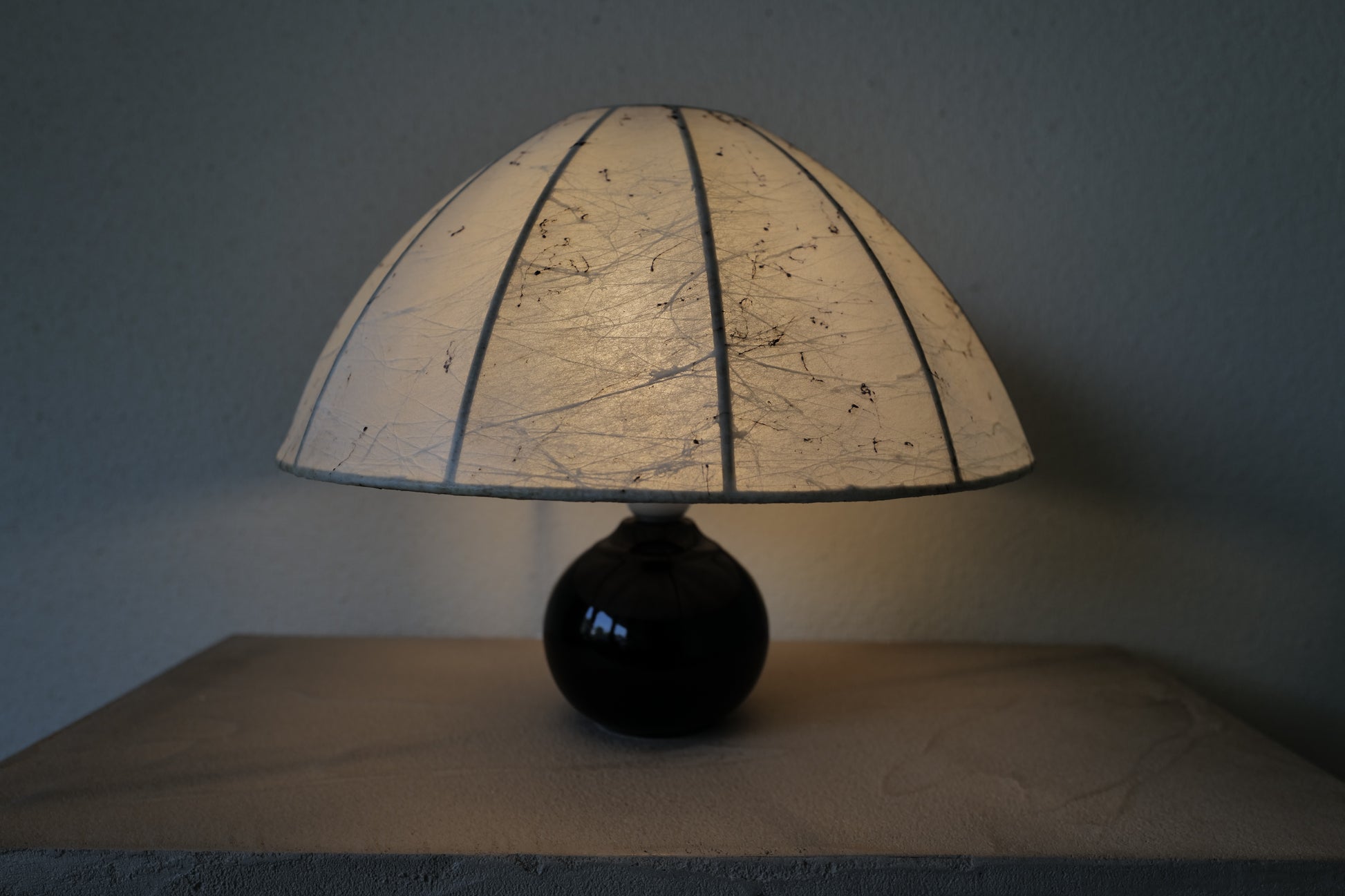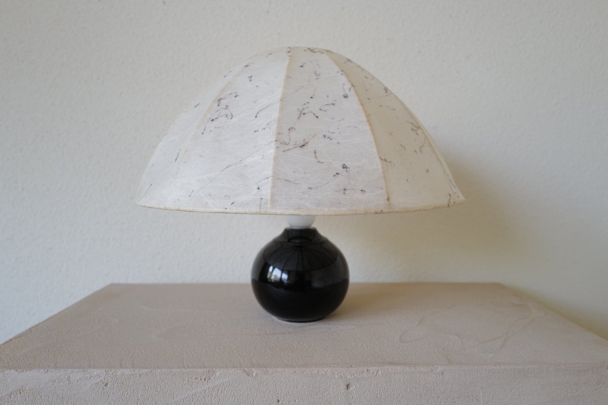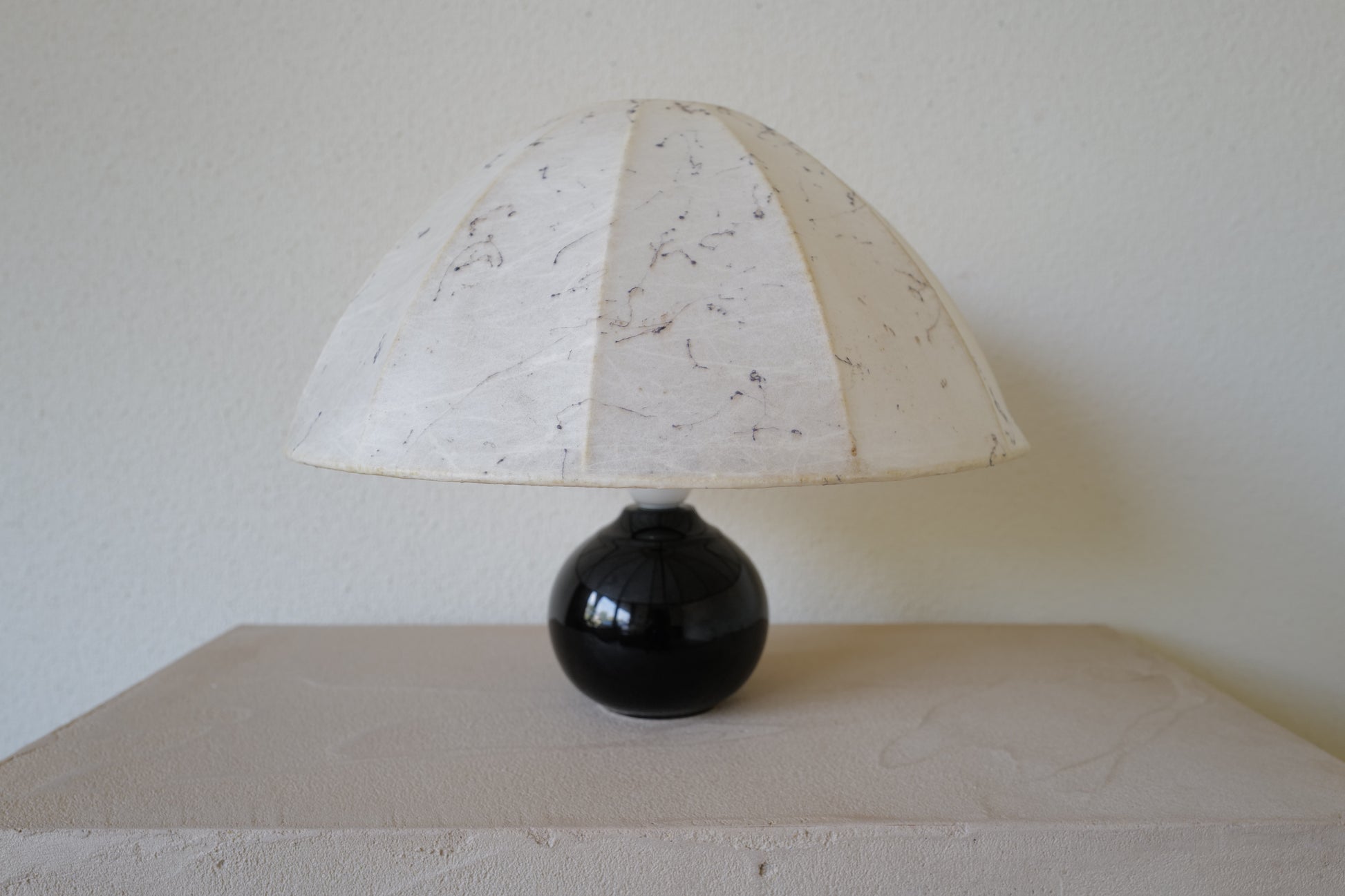1960年代に作られたコクーンシェイドを備えたマッシュルームランプ。ブラックのセラミックベースとシェードには美しいペイント、多分この先出会うことないすばらく可愛いテーブルランプになります。状態の方ですがシェードに線キレが1箇所ございます。1番最後の写真になります。
