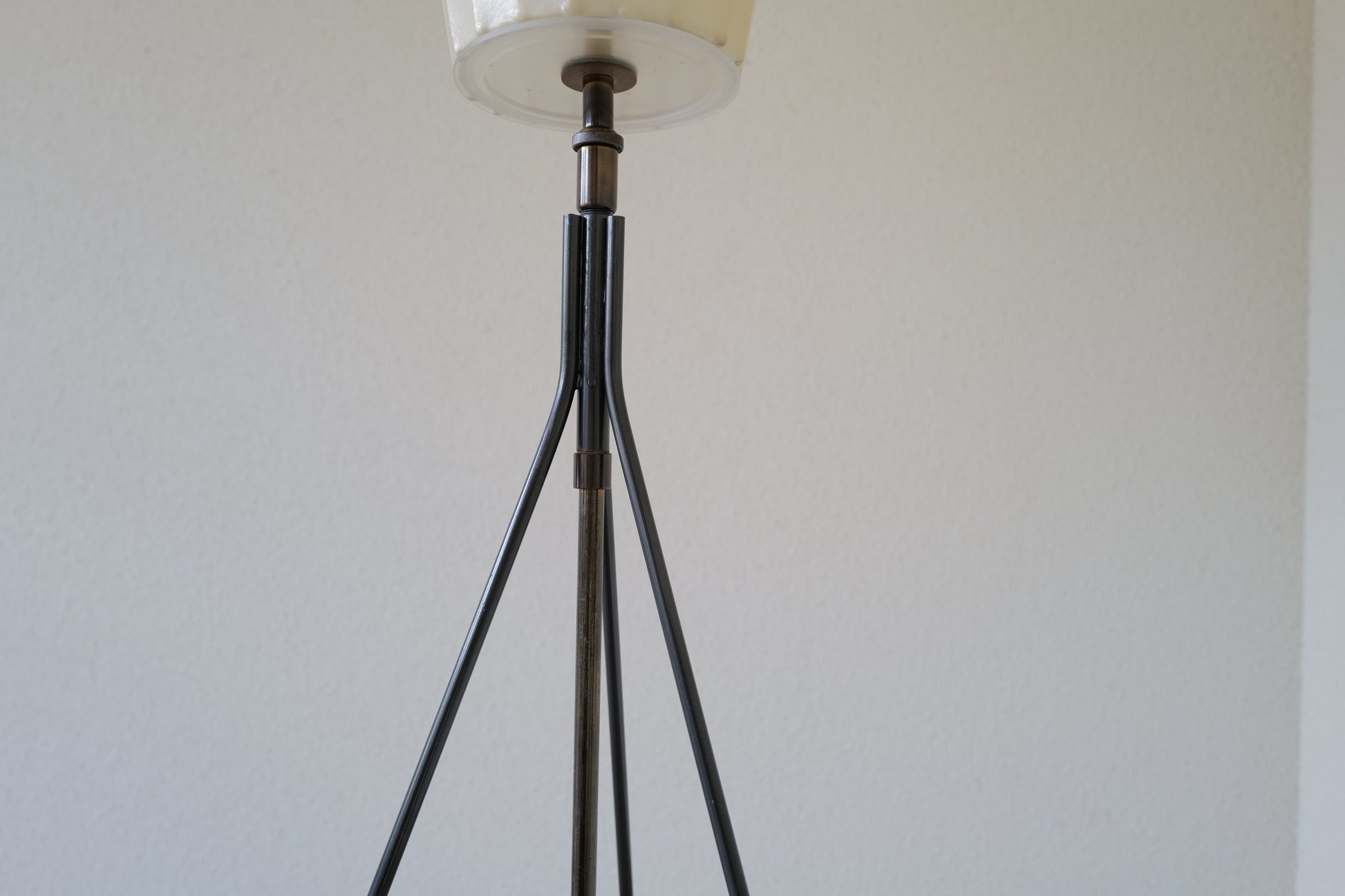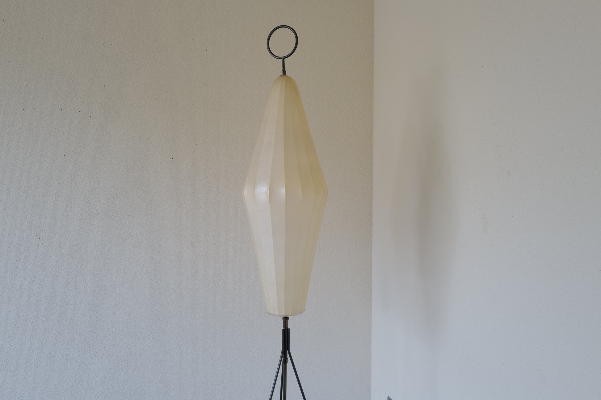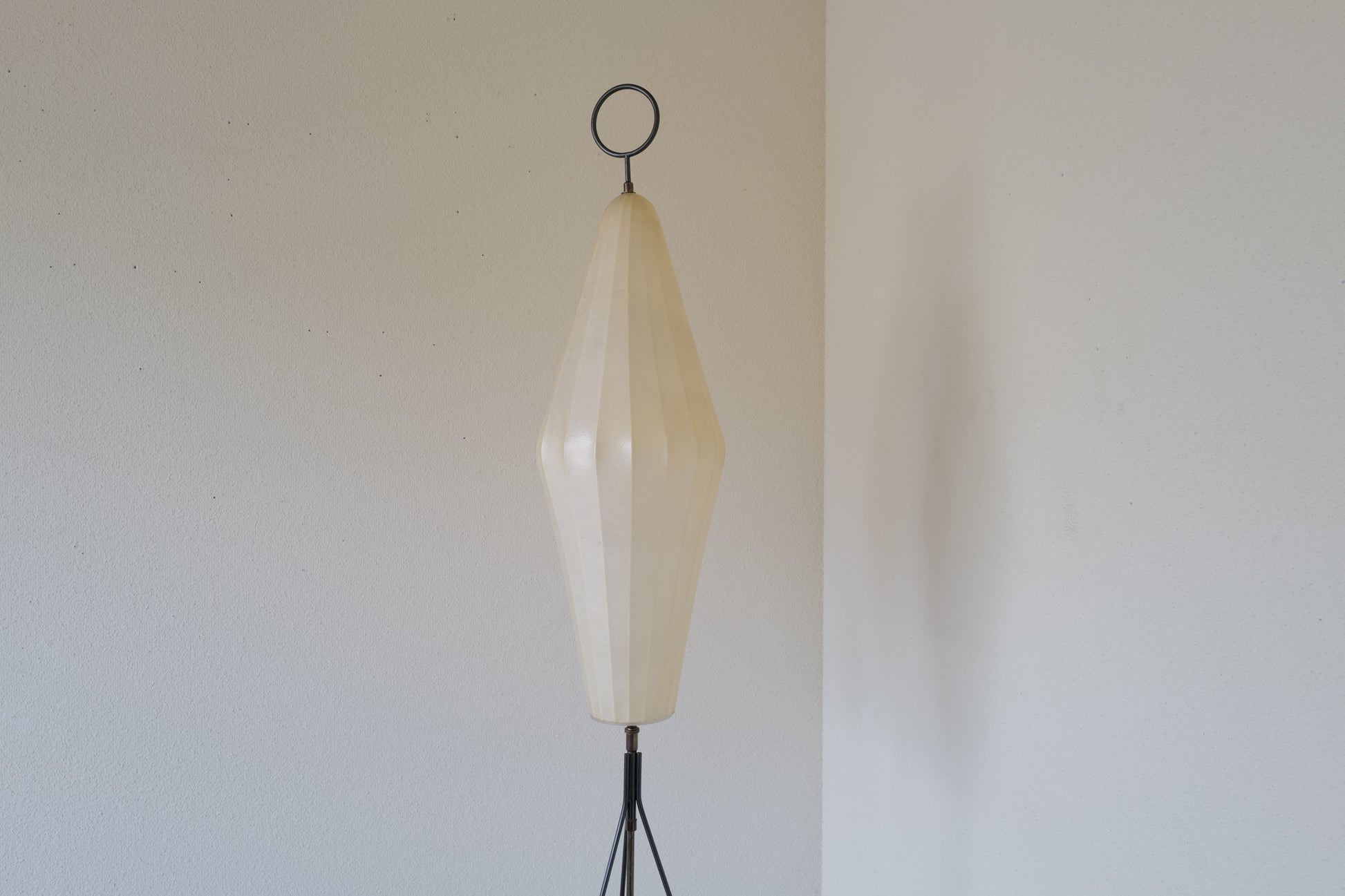 1960年代 ドイツで製造されたコクーンフロアランプ。鉄製の三脚足からの美しい佇まいはとても魅力的です。シンプルな作りですが存在感のある素晴らしい作品になります。状態の方は写真で確認しづらいですがシェードに3mmほどのキレと5mmほどのキレがございますが全体的には良好な状態を保っております。