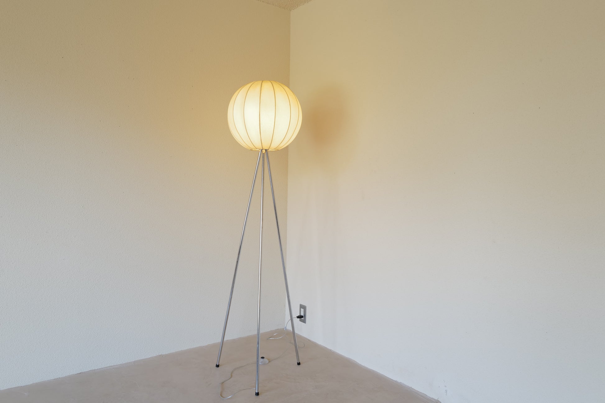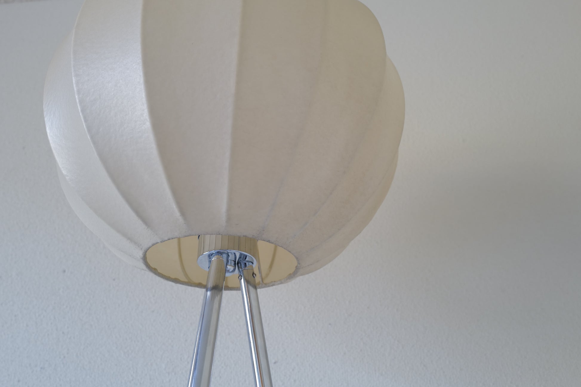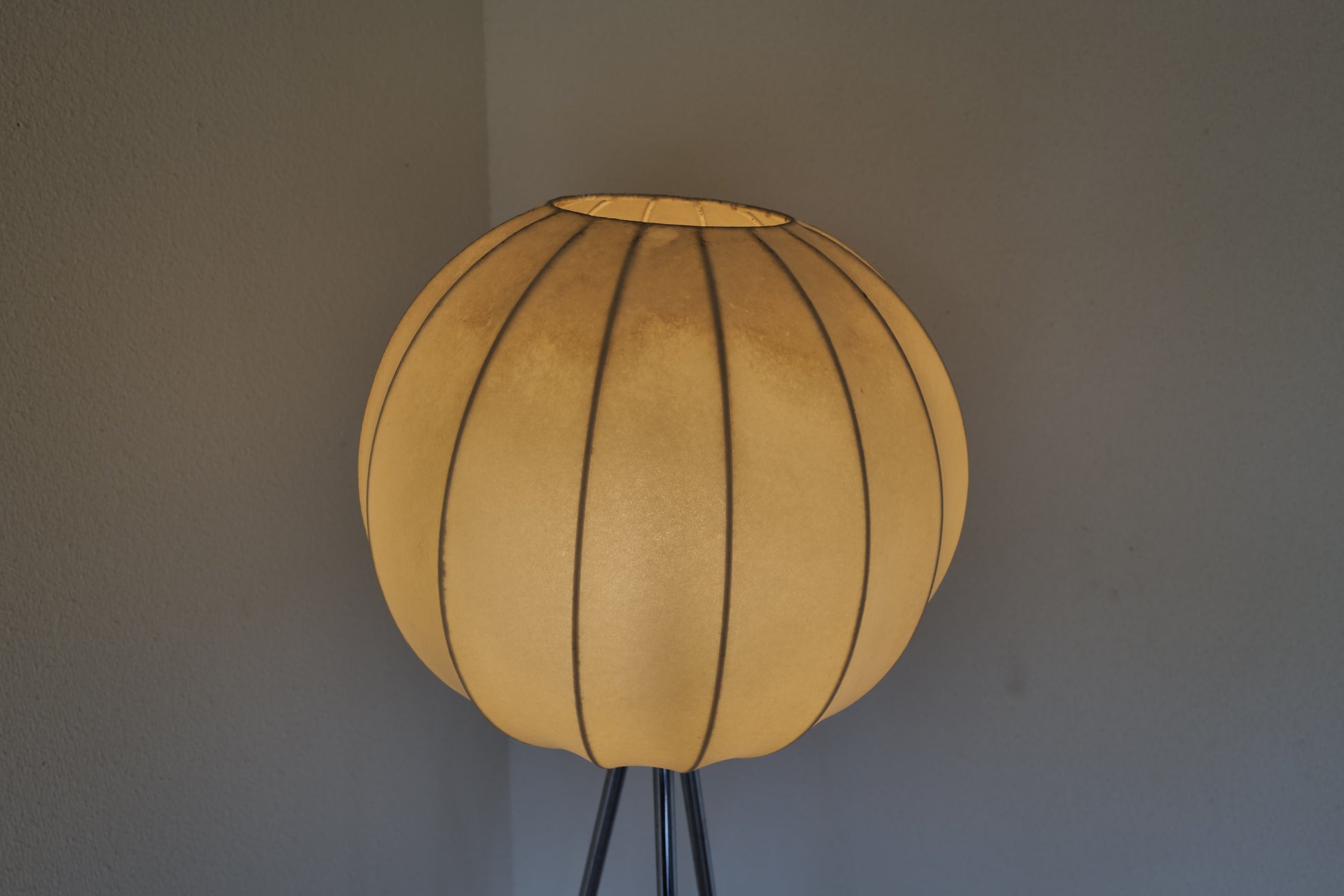 1960年代にドイツで作られたコクーンランプ。1つのコクーンシェイドでフロアランプとペンダントランプの2つを楽しんでいただけるようにフロア三脚とペンダント用のアタッチメントをご用意させて頂きました。シェイドの状態は破れなどはないです。経年による焼けがありますがとても雰囲気のある作品になります。