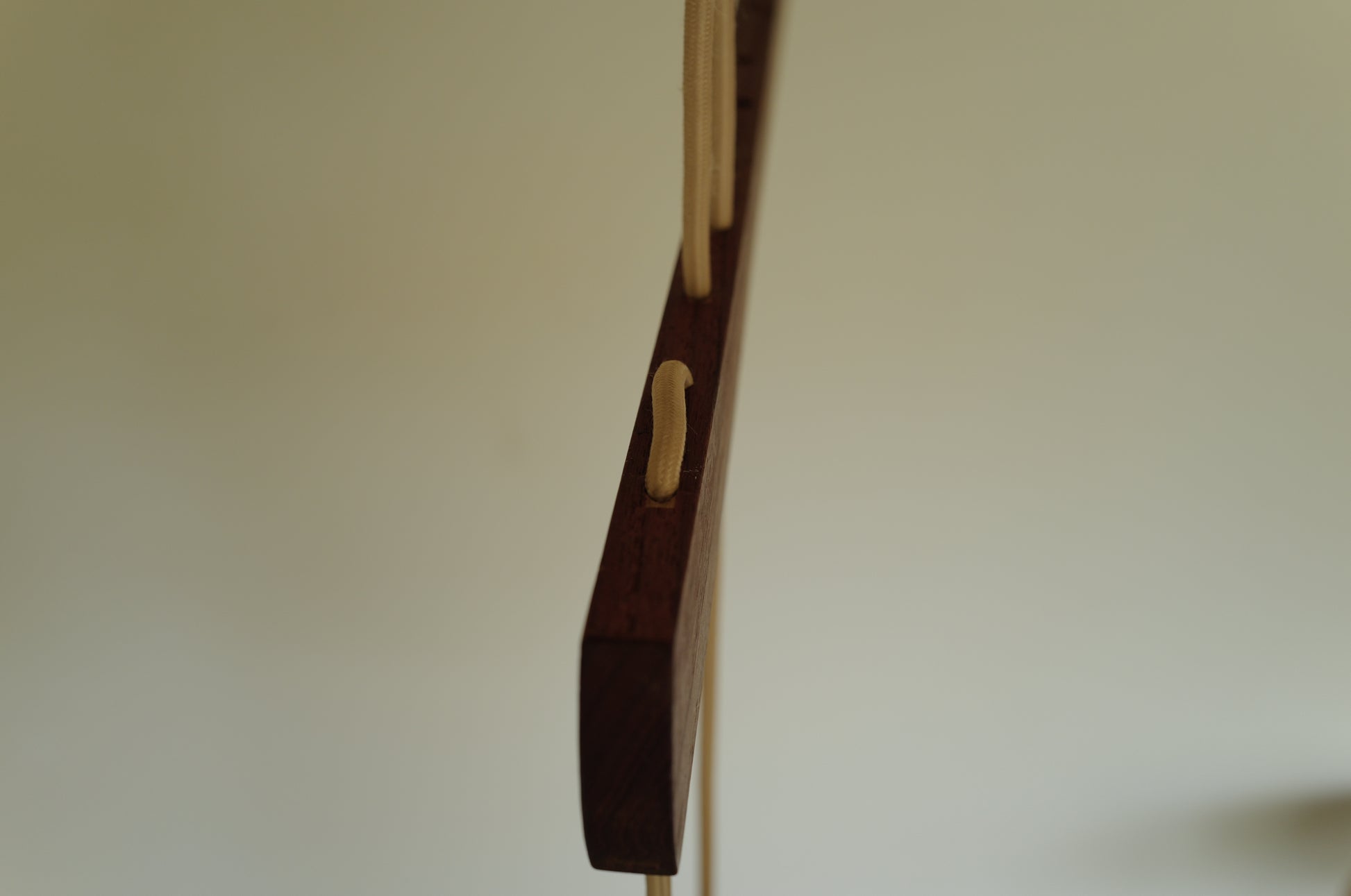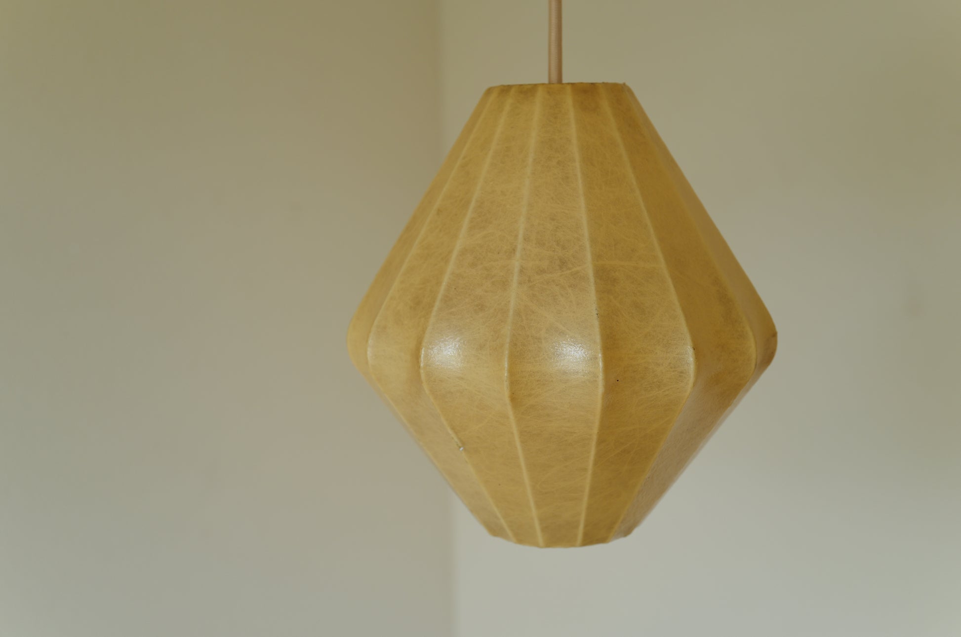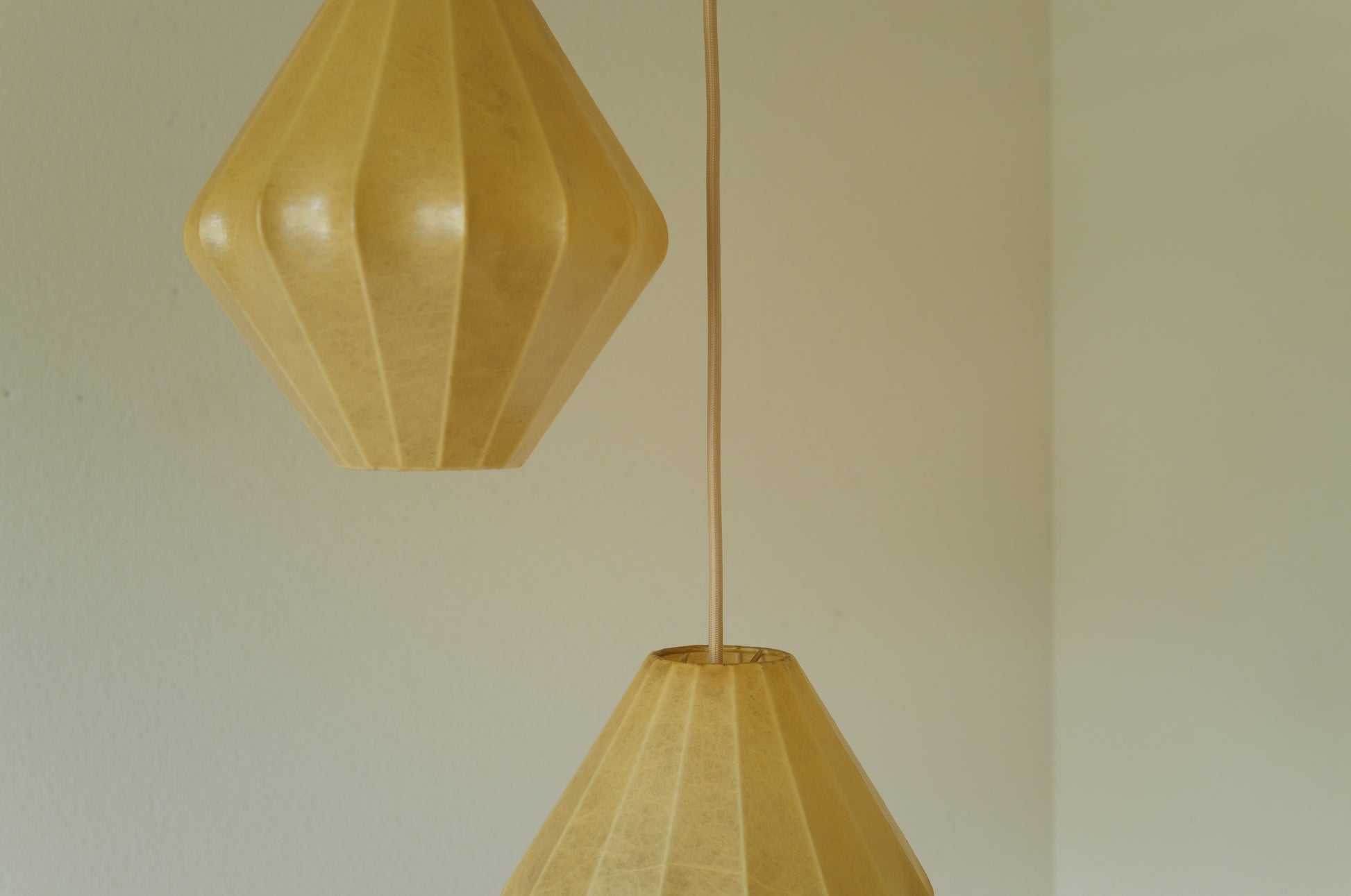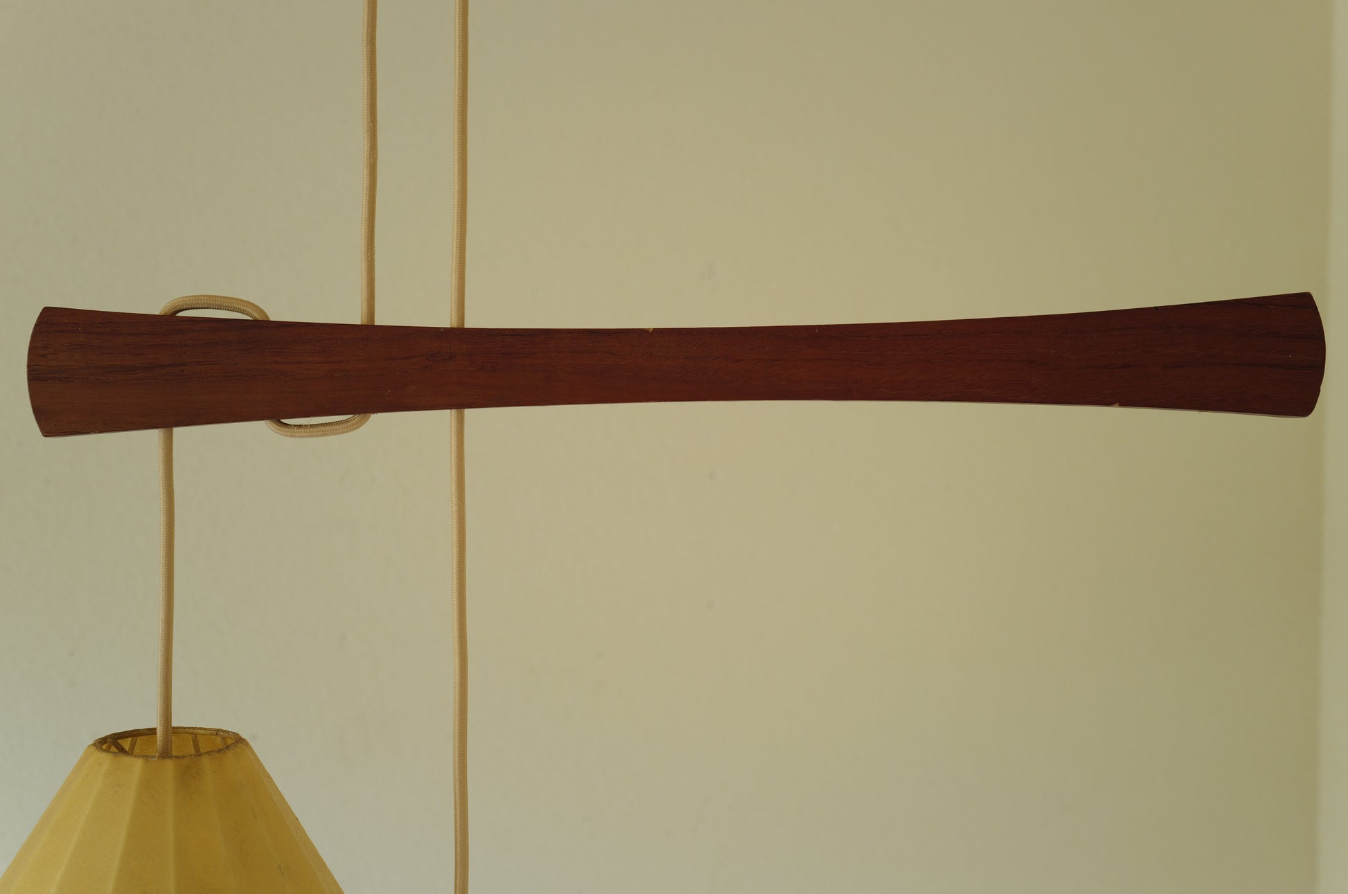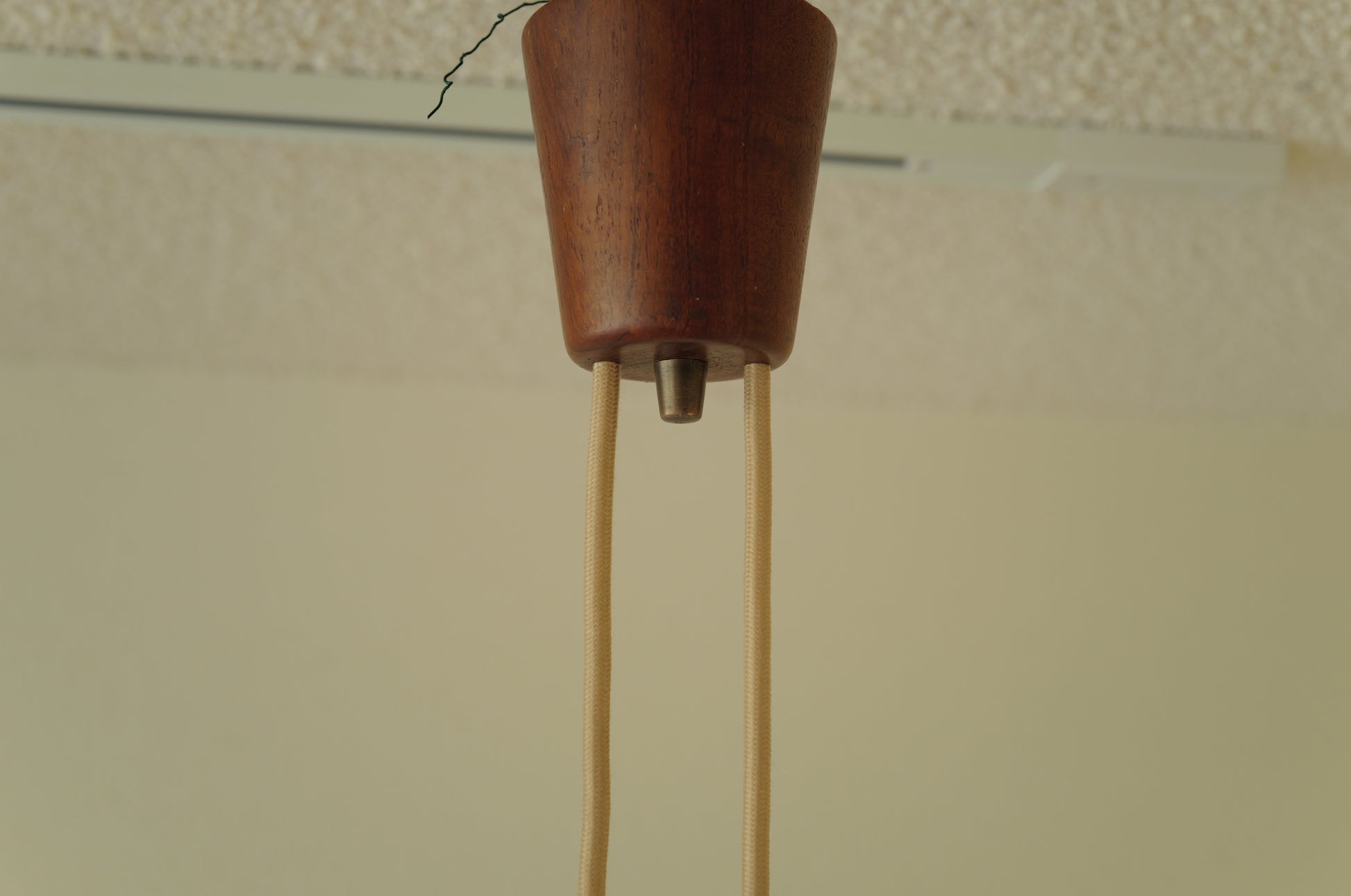 1950s~60s前期に製造されたコクーンランプ。hans agne jakobsson?の作品ではないかと思われる作品。チーク材のクロスバーにコードを通し作品の雰囲気を変化させるシンプルで面白い構造のお部屋の雰囲気でクロスバーからの吊し方を変化させることも可能なものになります(配線、引掛シーリングの取り付けが必要になります)現状は写真の形で販売になります。