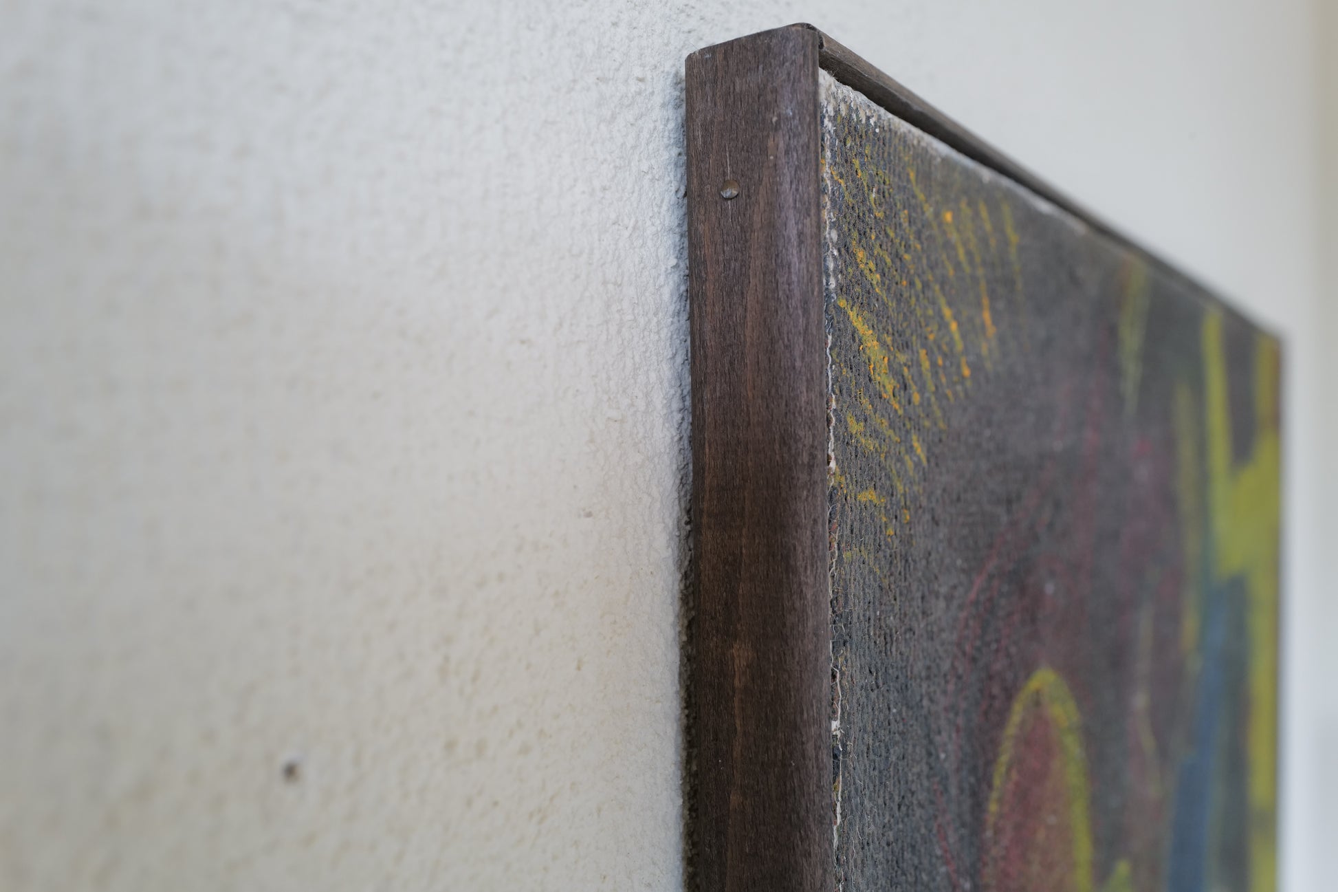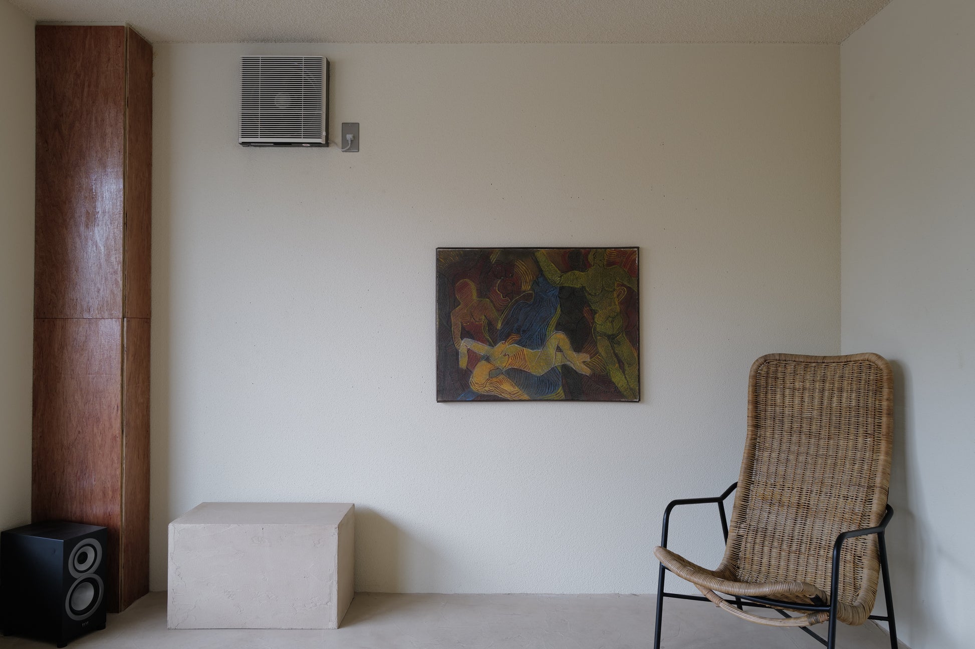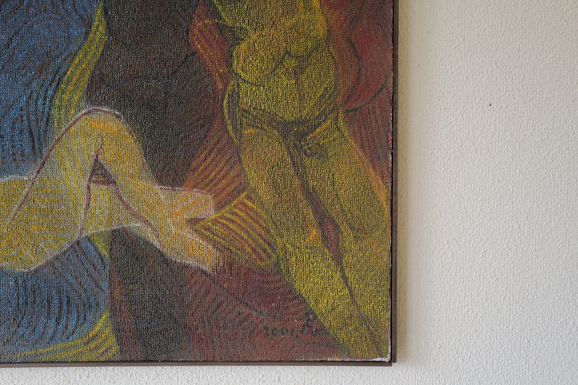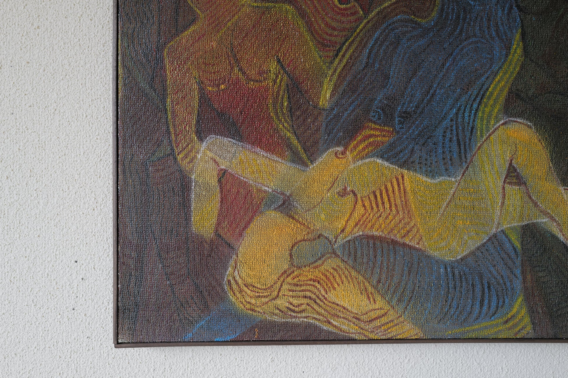 1980年代ごろに製作されたと思われる作品になります。細かくボコボコしたキャンバスの特性をいかした裸体の作品は光の反射によって色が明るく見えたり暗く見えたりと面白い変化をしてくれます。裸体を描いた具象絵画でありながら抽象画を思わす曖昧さが魅力的な作品になります。自然光が入る場所に設置していただくことでこのアートの本質を楽しんでいただけるかと思われます。絵の右下には画題もしくは作者名の記入がございます。状態は額縁に若干の反り、角の辺りにスレとうございますが裏側からしっかりと補強がされておりますので安心してご利用いただけると思われます。