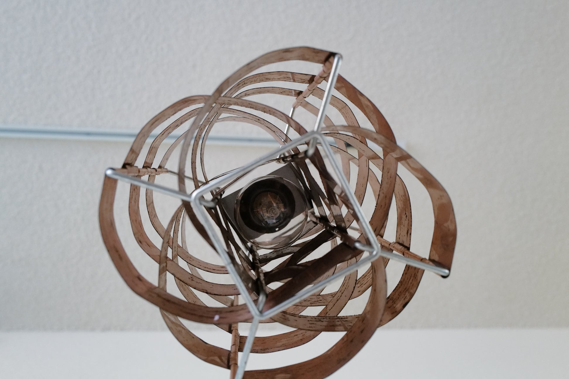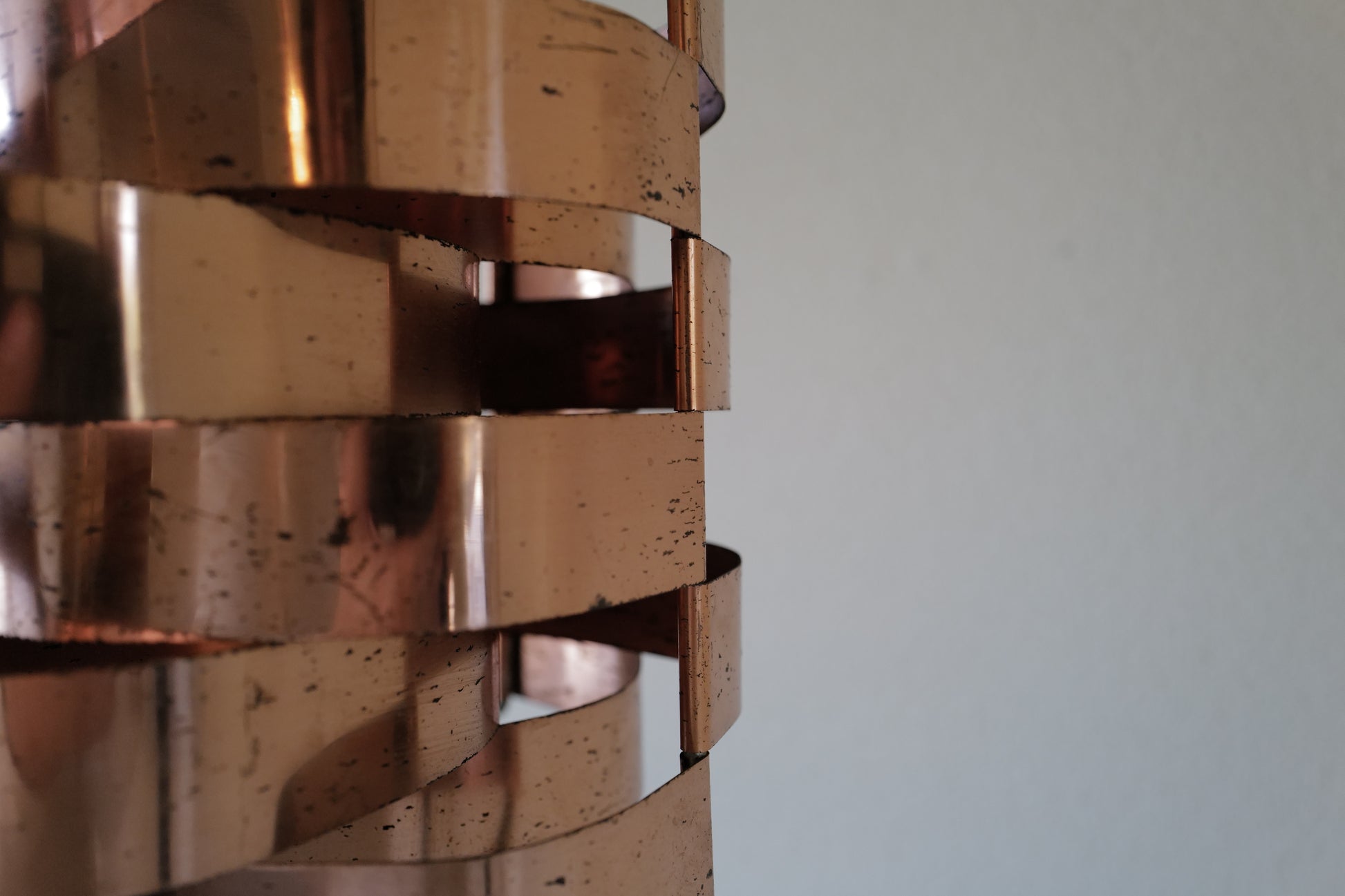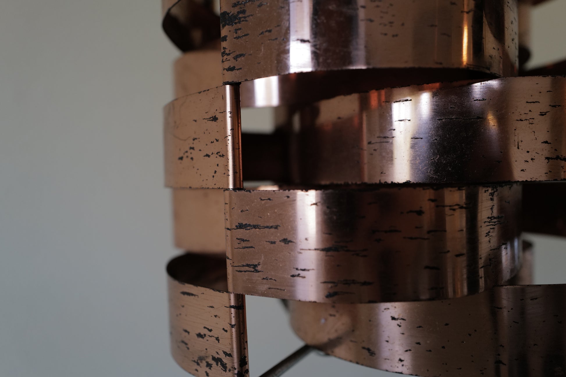 モデル「マース」は、1970年代にフランスでMax Sauzeによってデザインされました。金属フレームに湾曲して折り畳まれた銅色のスラットがあります。マックスの作品は繊細で美しいです。全体に錆がございます。写真を参照ください。