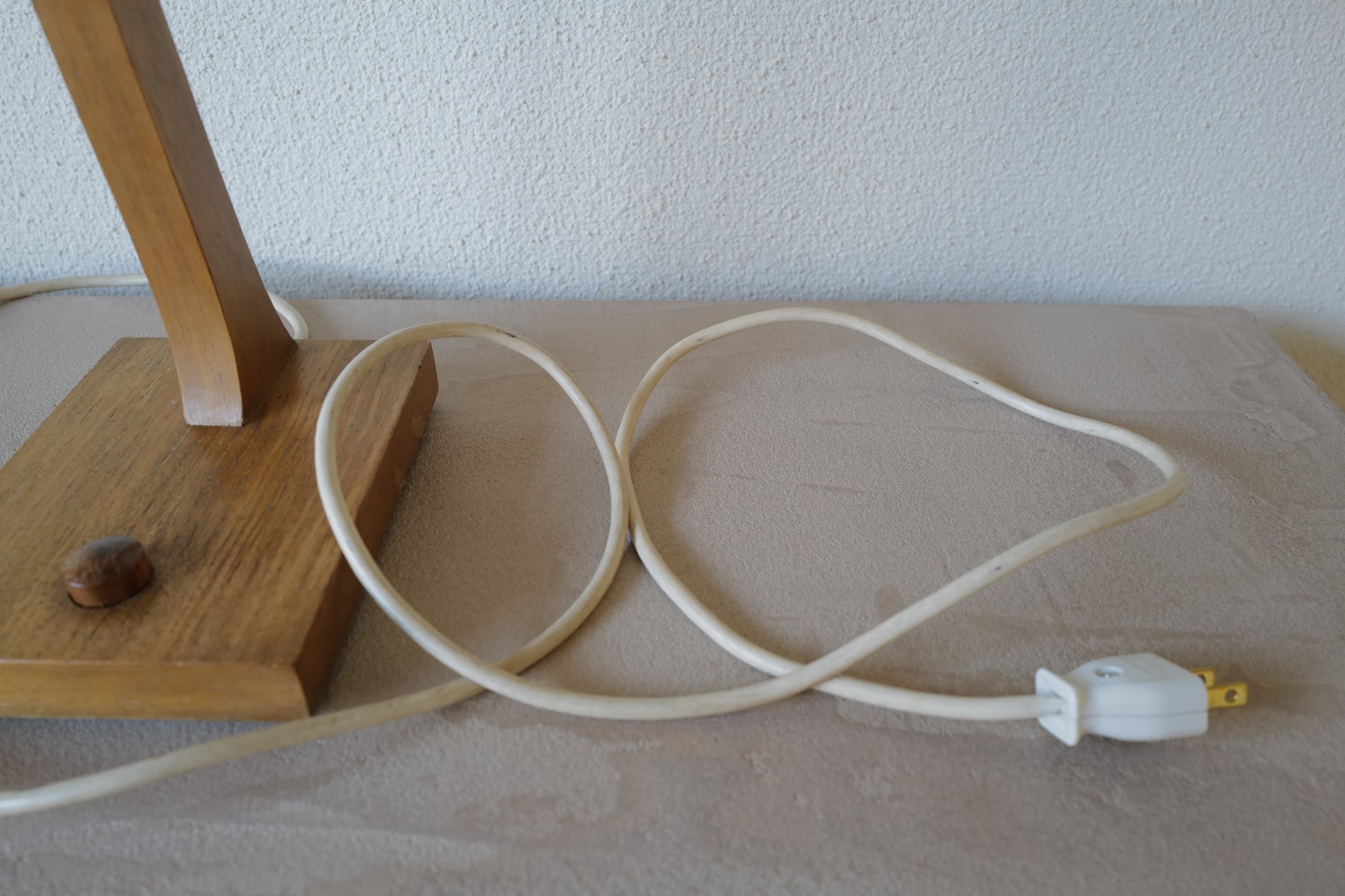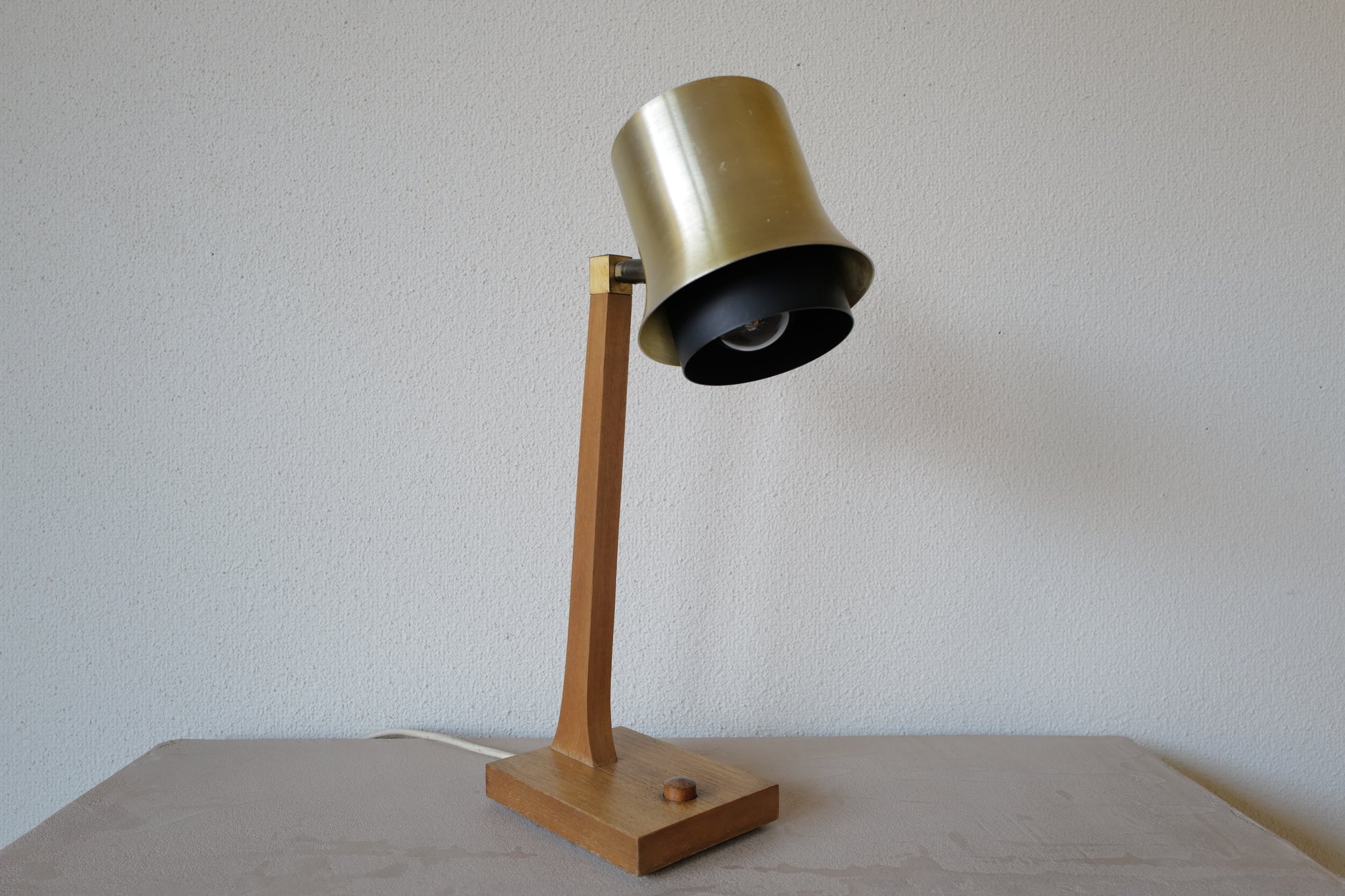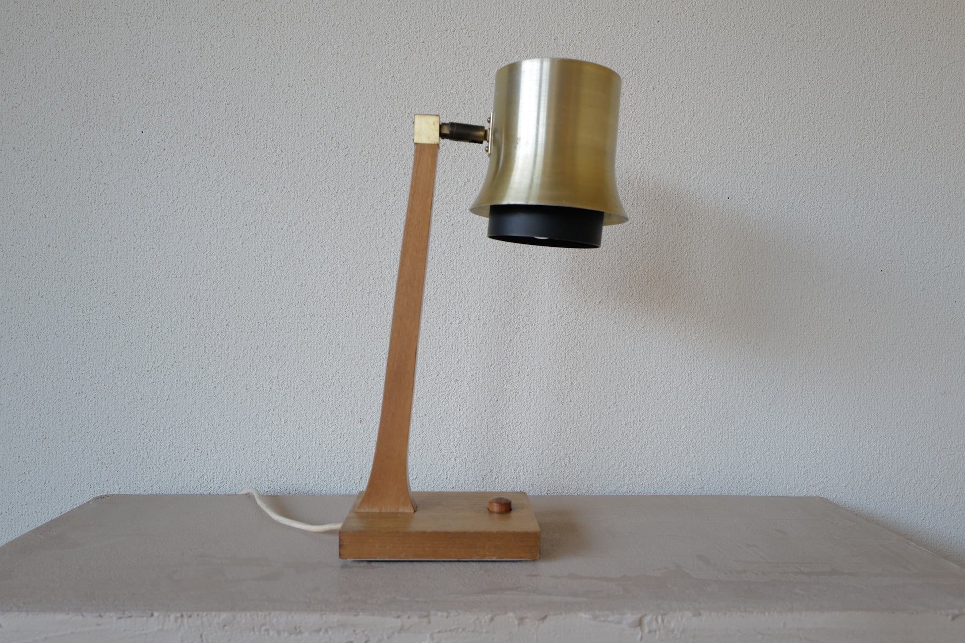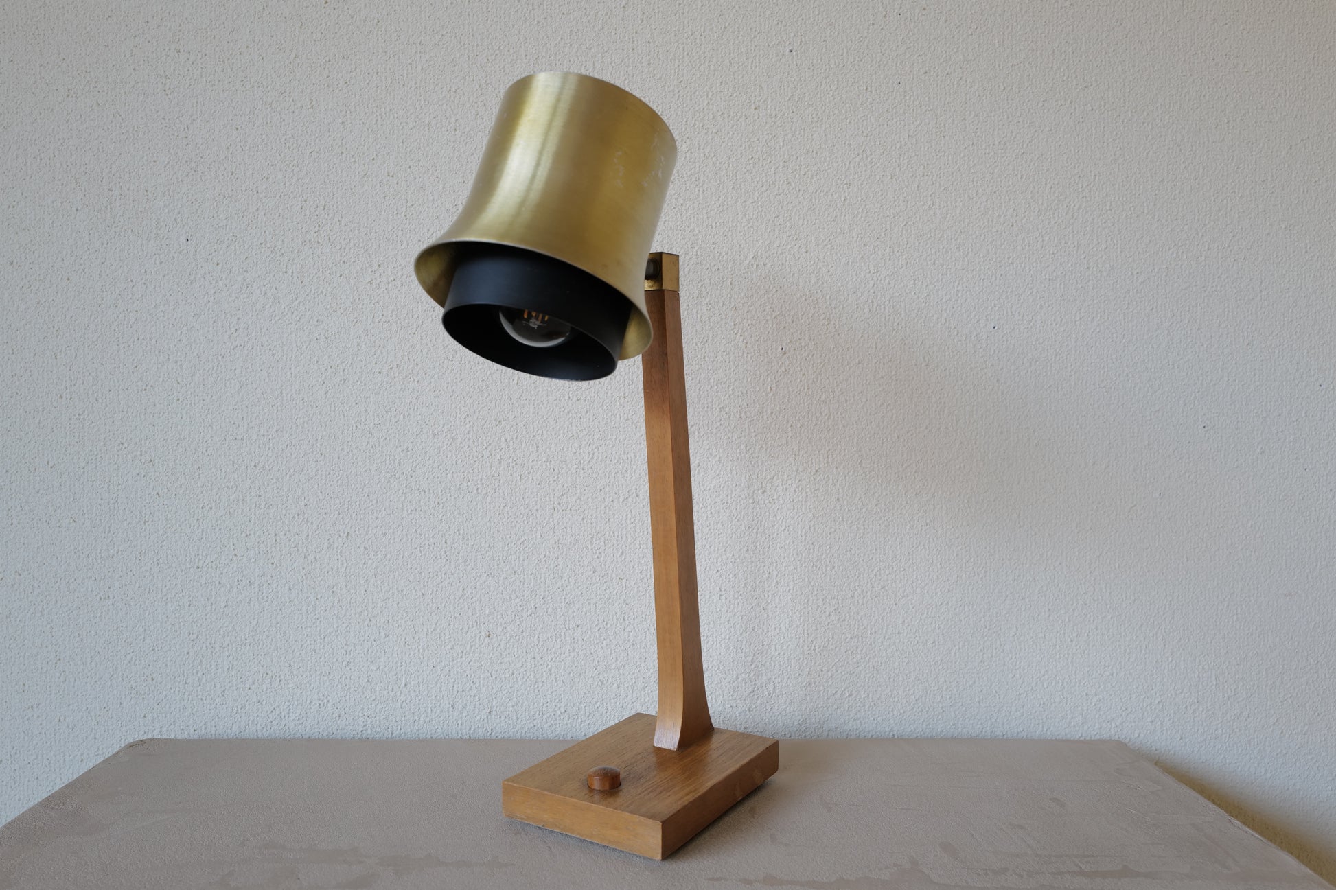 1950年代デンマークで製造されたランプ。ウッドのベースからアーム、真鍮のシェード、それからウッドのボタンスイッチ。とても素敵な北欧のランプです。