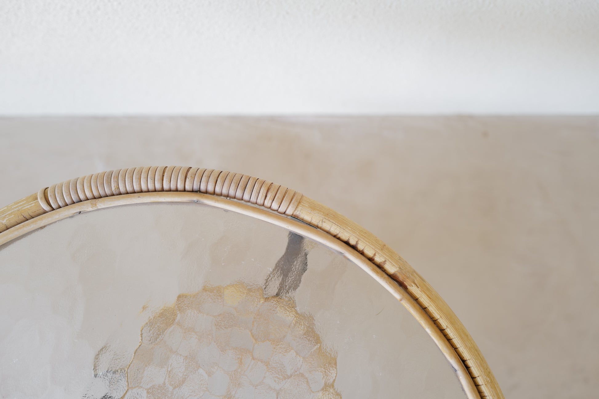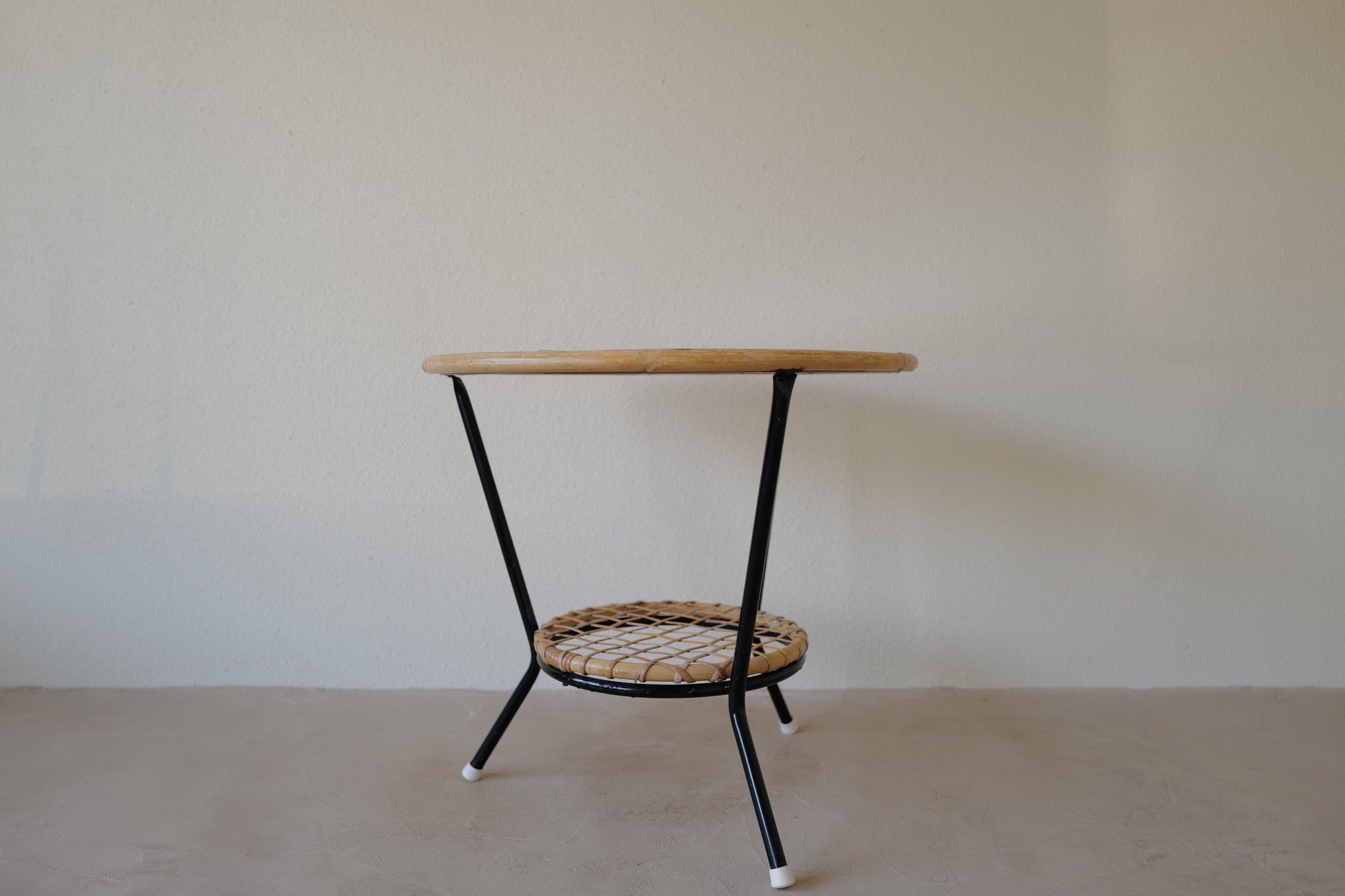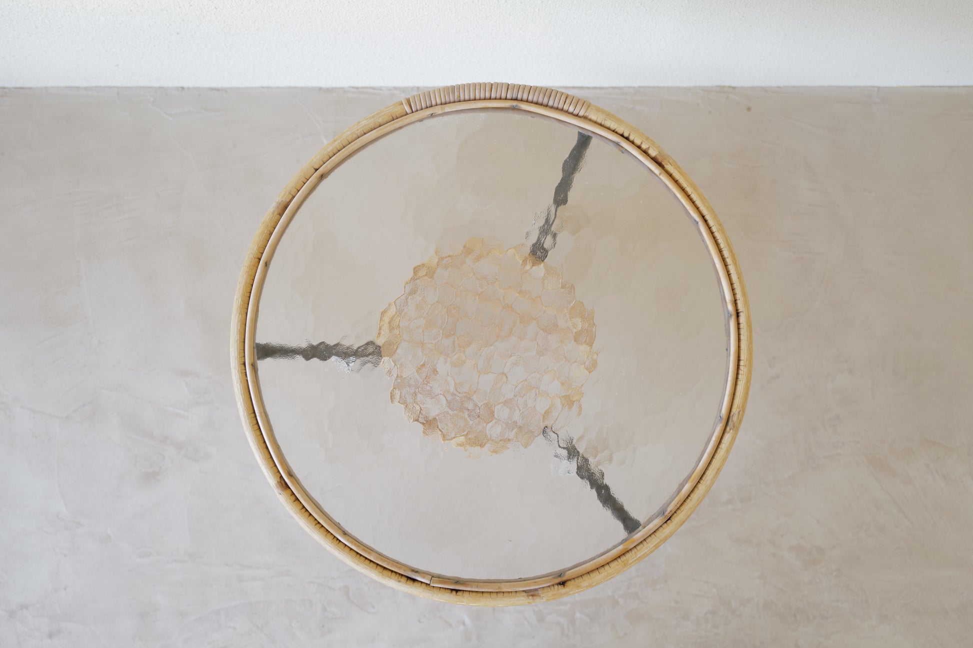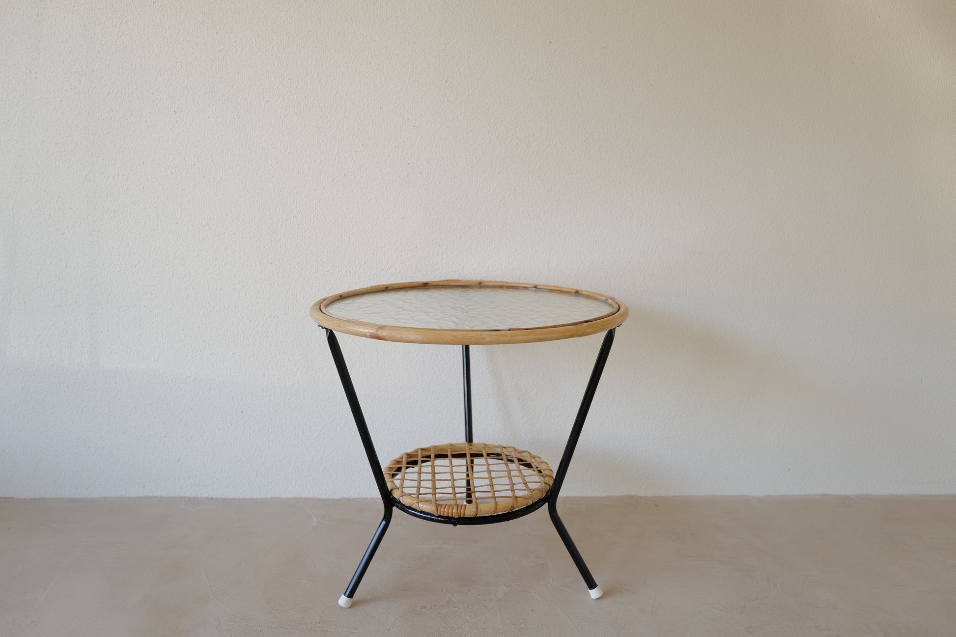 1970年代 オランダのローエ・ノールトウォルデのサイドテーブル。籐とガラスの組み合わせが可愛らしい素敵なテーブル。ランプの灯が映し出すガラスの影に魅了されます。