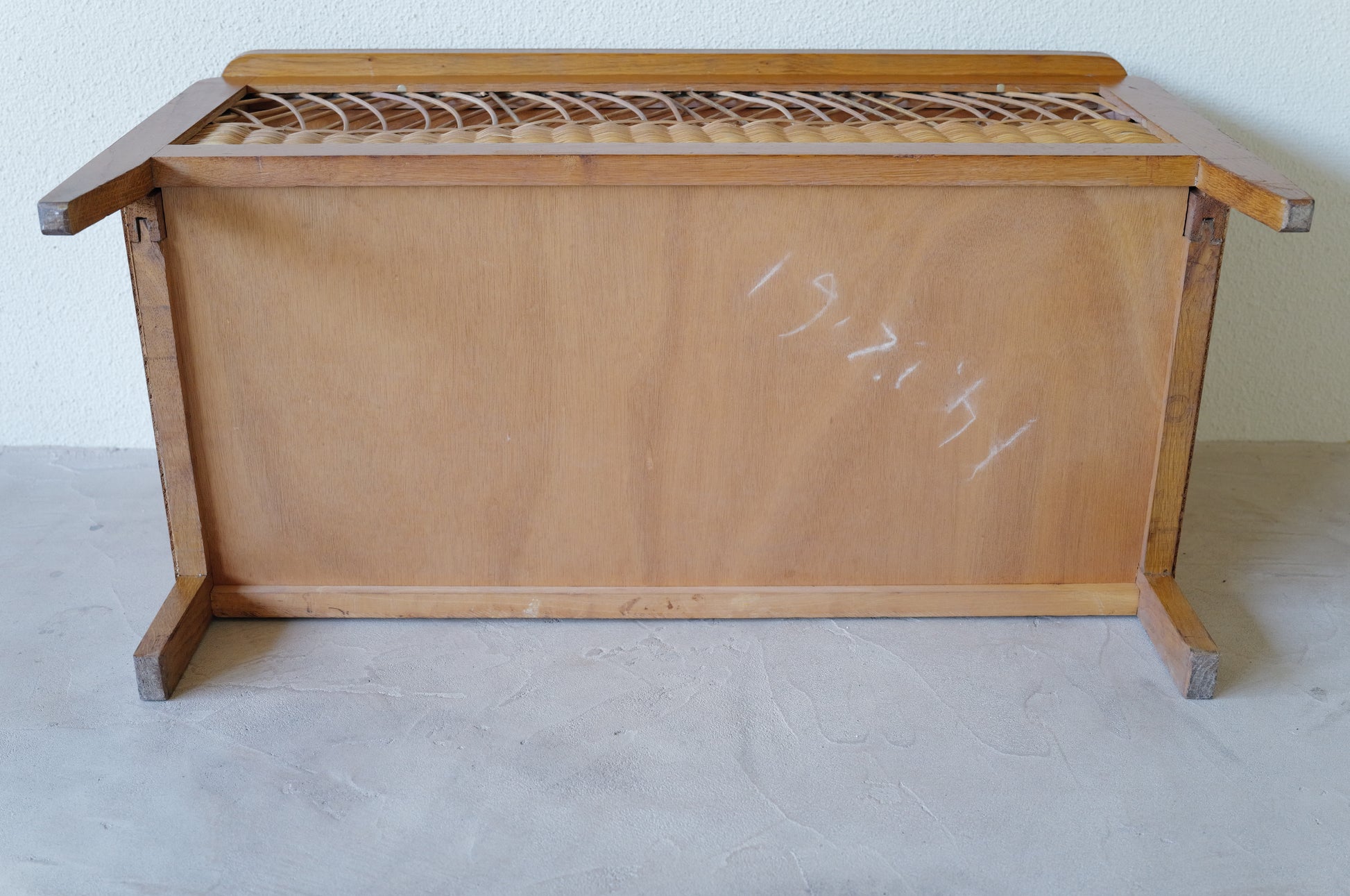 1960年代にフランスで作られたラタンの装飾が可愛らしいおもちゃ箱。状態は全体的に経年の使用感がありますが雰囲気が良く、サイドボードのように使用したり、収納boxとして使ったり想像するだけで面白い作品になります。
