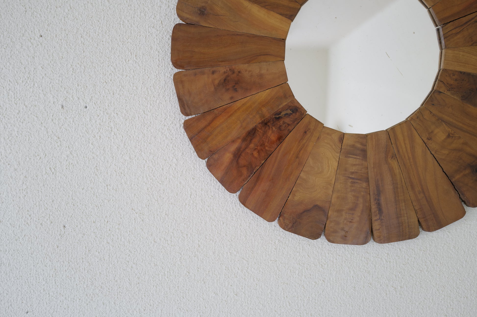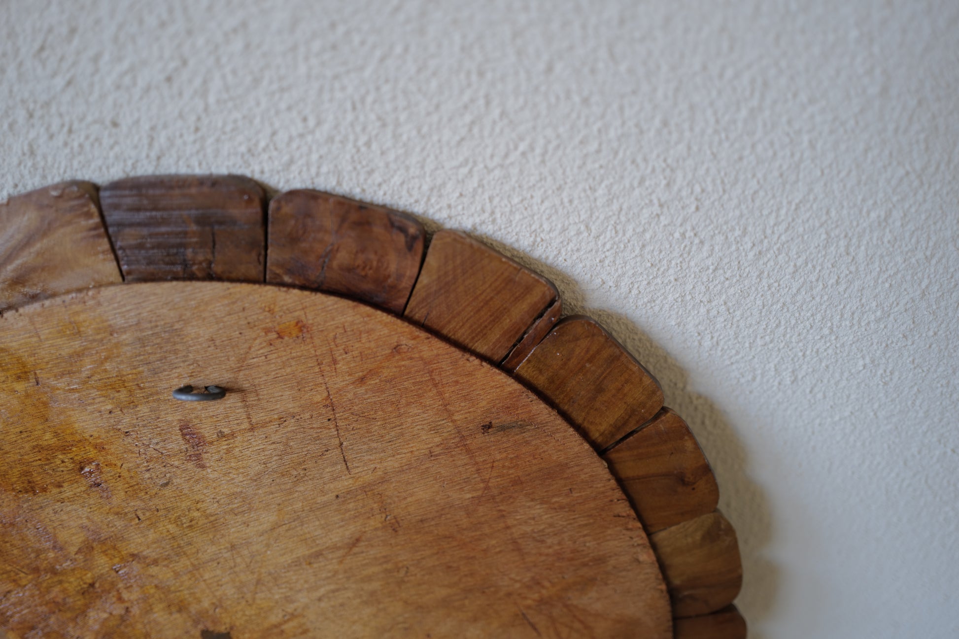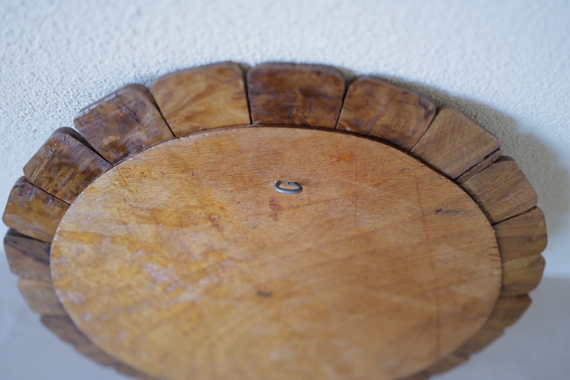 およそ1960年頃に作られたと思われる。太陽、または花をイメージして作られた木製の鏡。一つ一つの木目が美しい作品になります。ミラーの状態は経年によるダメージが多く見られます。鏡として使用はできないこともないですがピアスをつけるくらいが限界かと思われます。