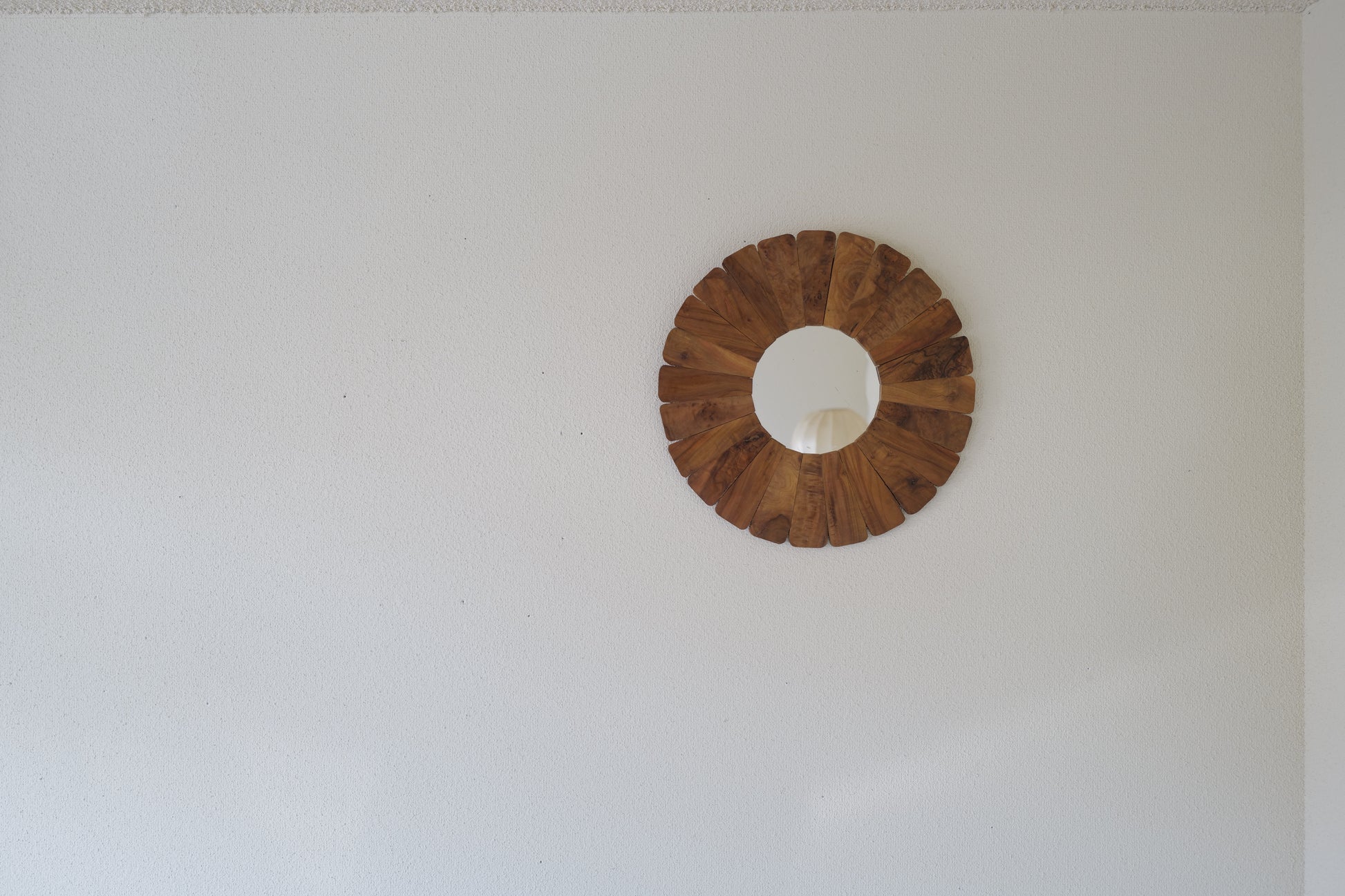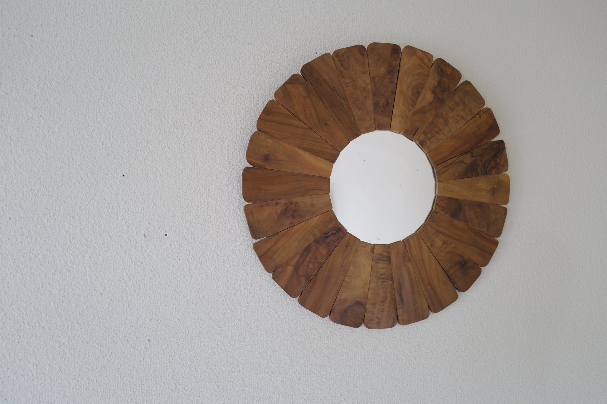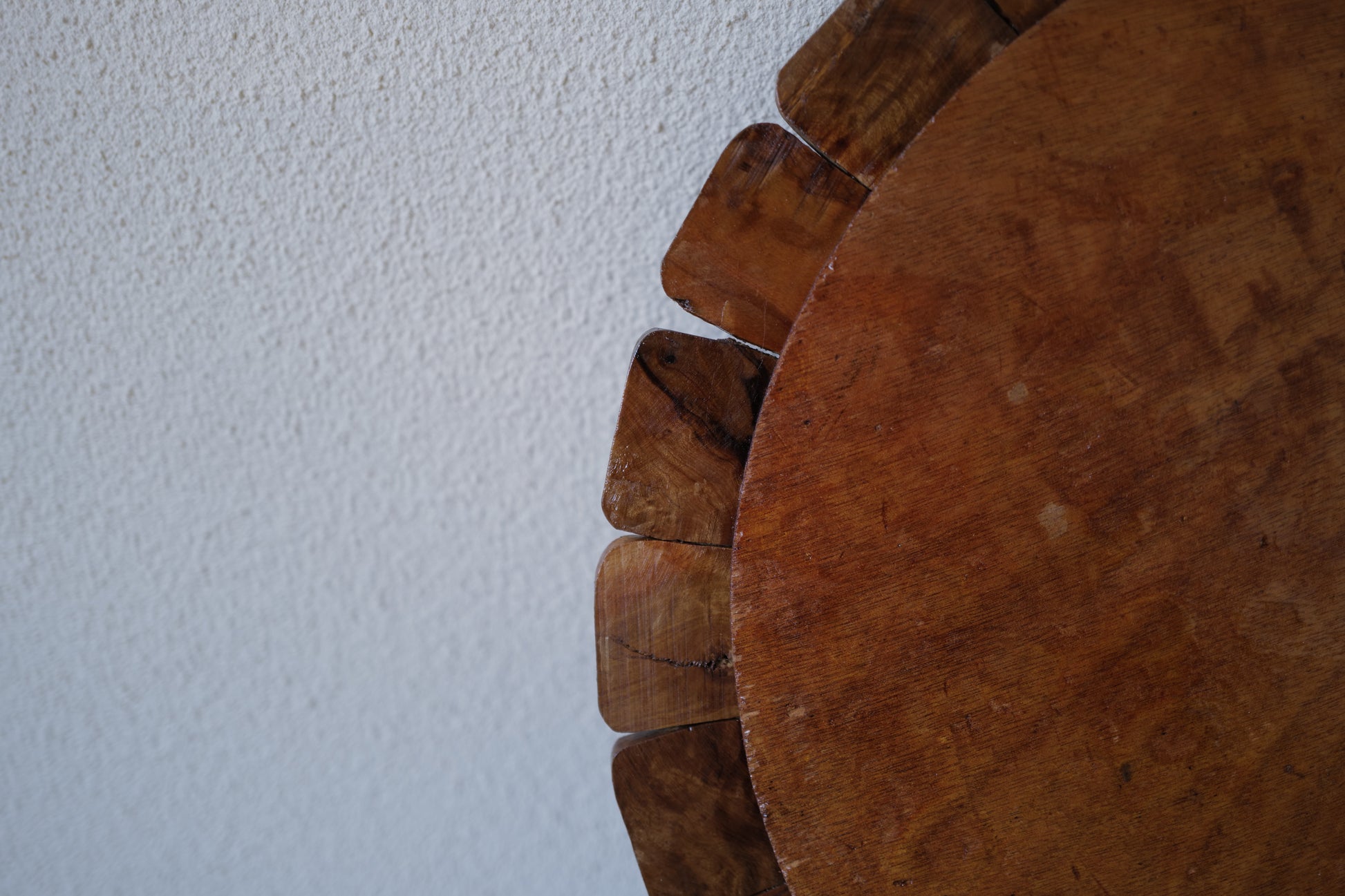 およそ1960年頃に作られたと思われる。太陽、または花をイメージして作られた木製の鏡。一つ一つの木目が美しい作品になります。ミラーの状態は経年によるダメージが多く見られます。鏡として使用はできないこともないですがピアスをつけるくらいが限界かと思われます。