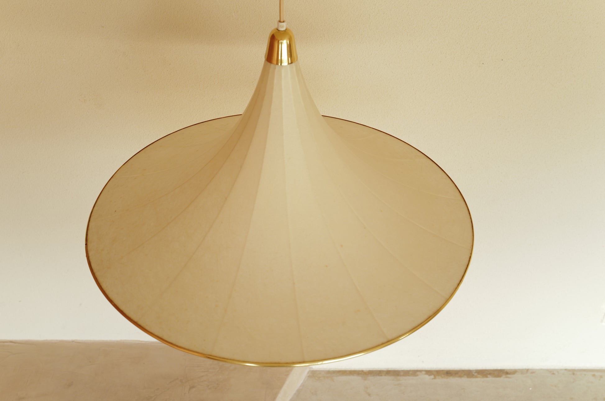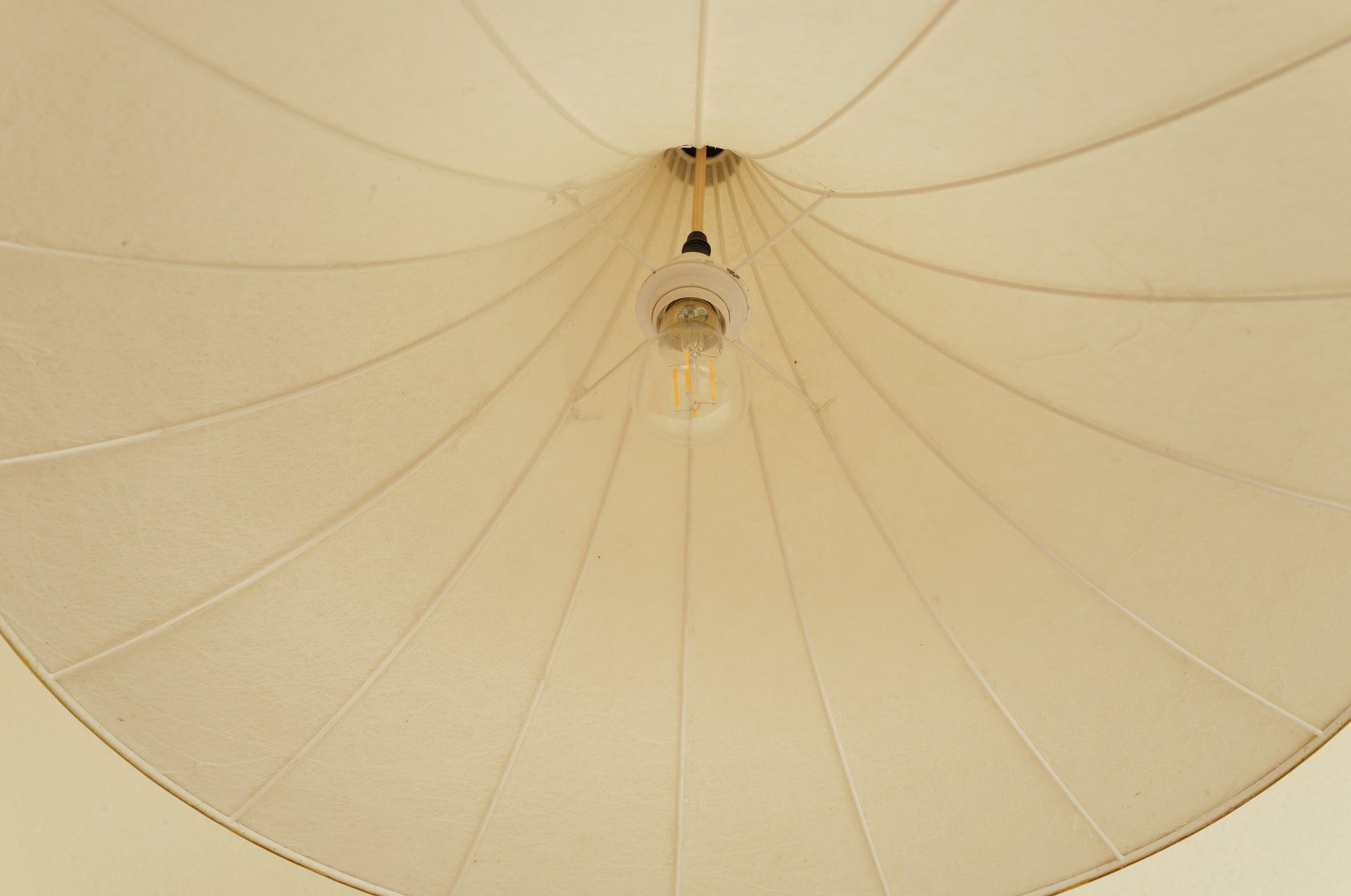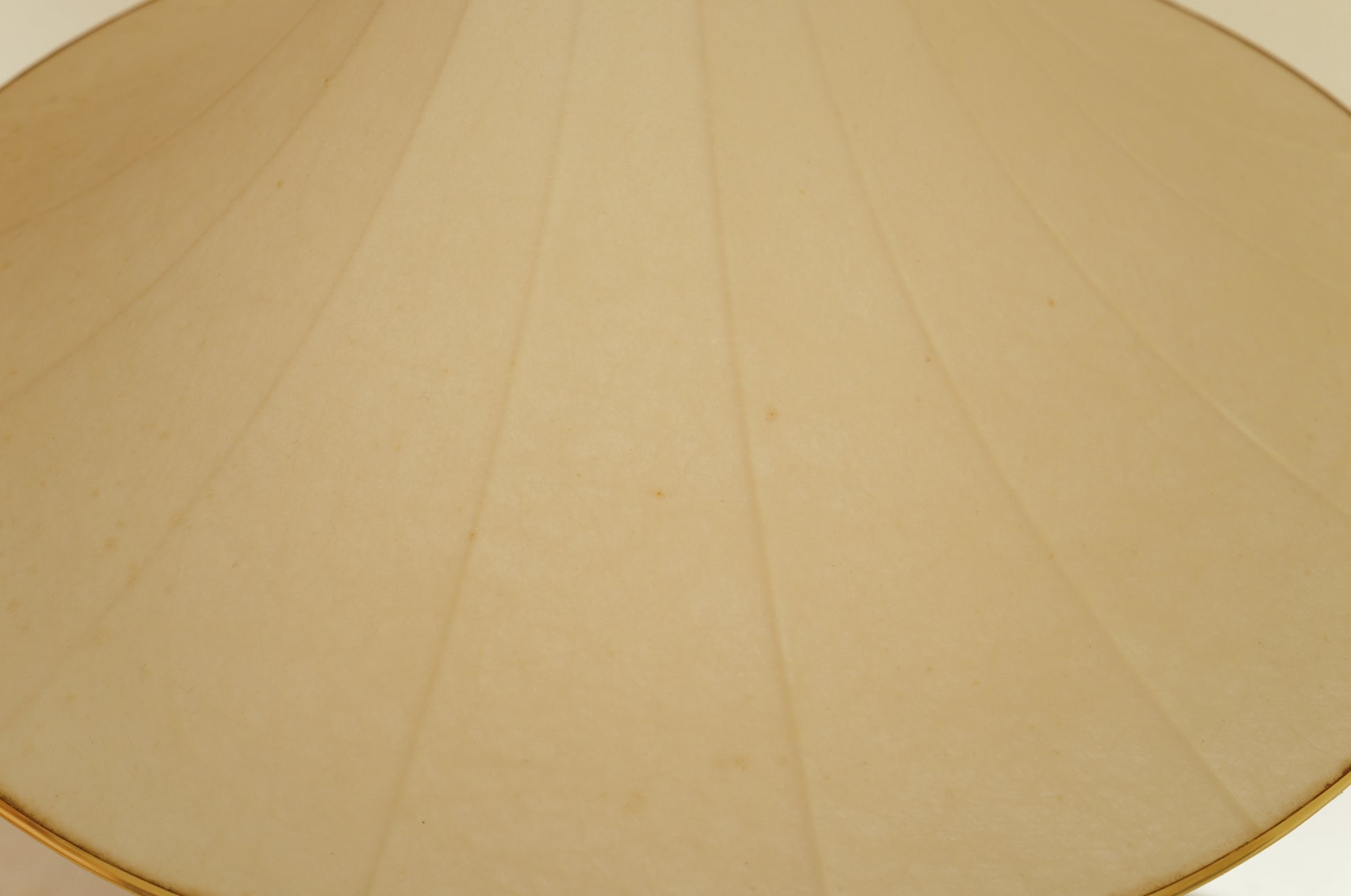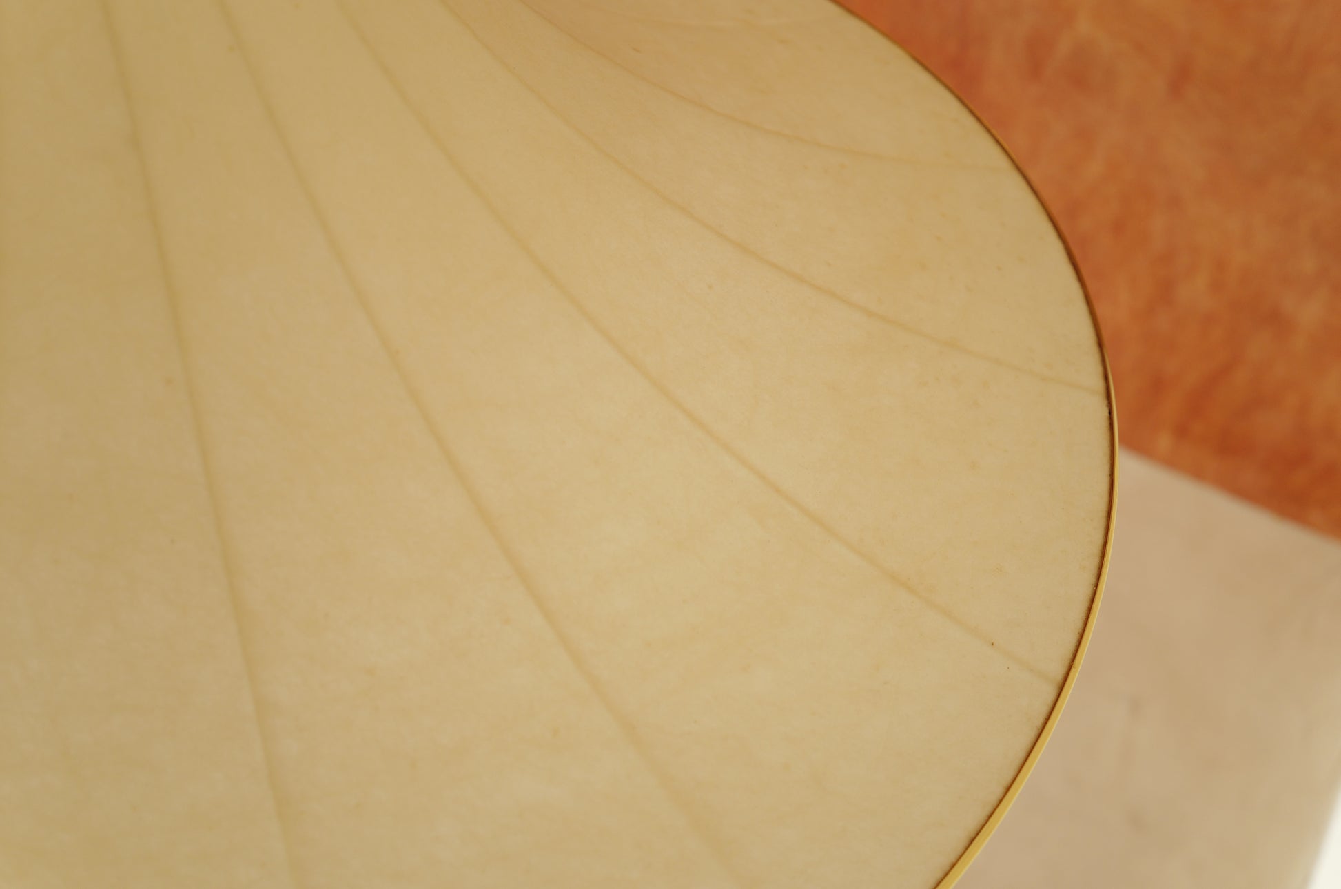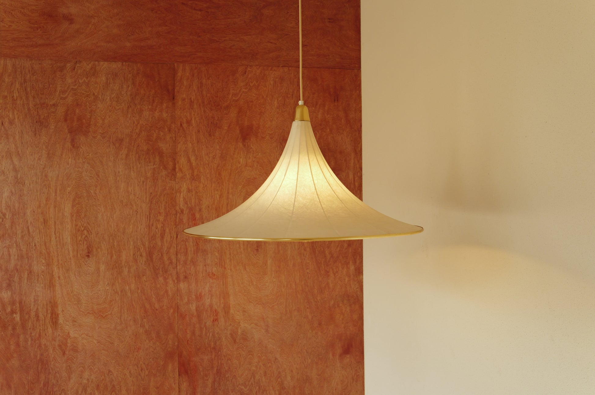 1960sに制作されたトランペットデザインのコクーンランプ。最大直径70cmと非常に大きな作品になりますがデザインの美しさとコクーンシェードの柔らかさが圧迫感を感じさせない、とても魅力的な作品になります。状態はシェードの一部に目立たない程度のシミがございますが全体的に良い状態を保っていると思われます。
