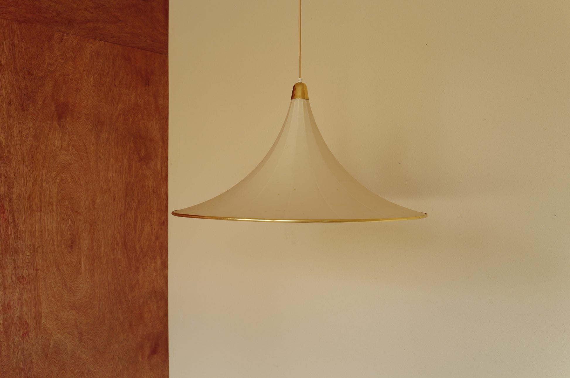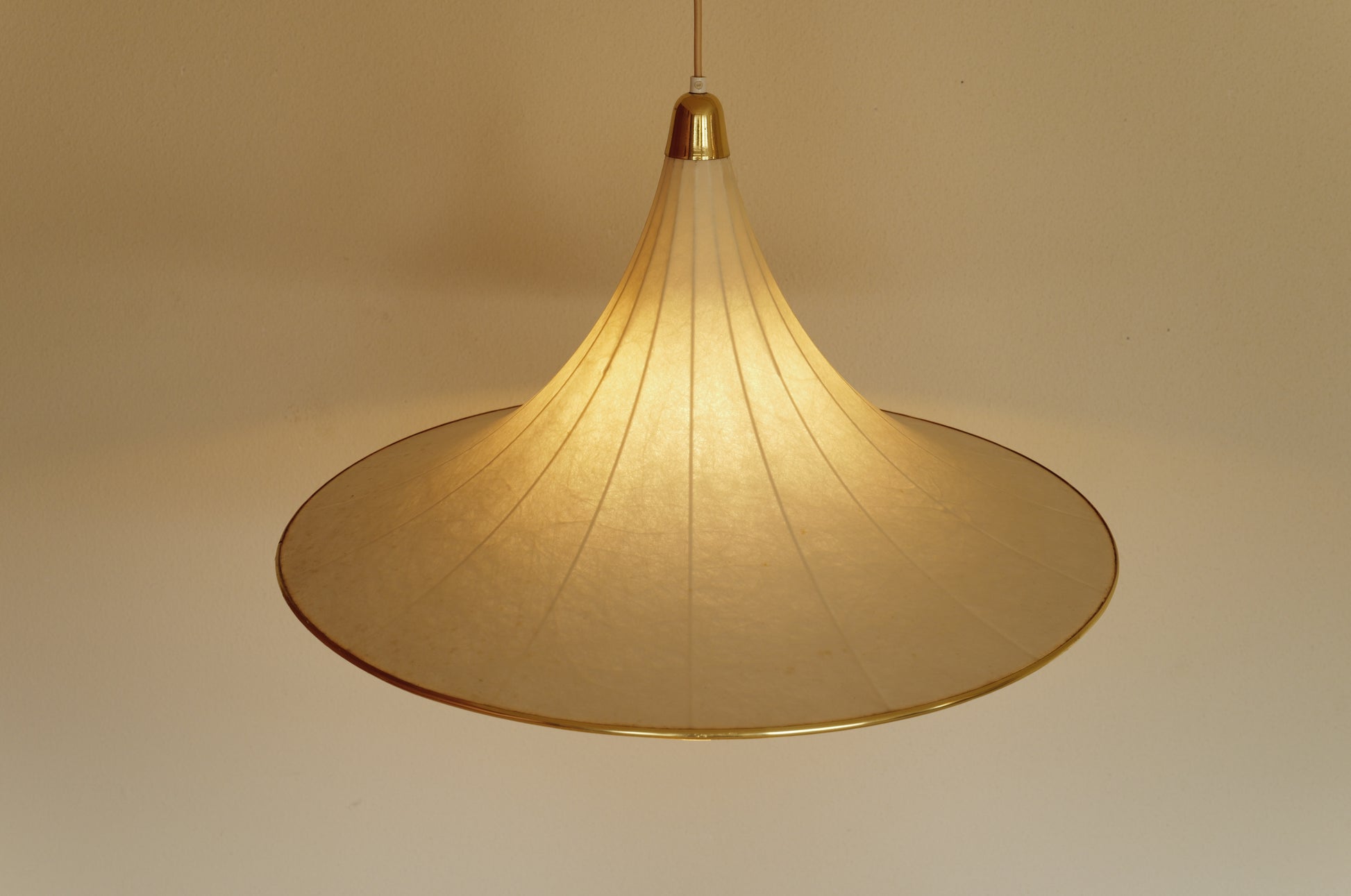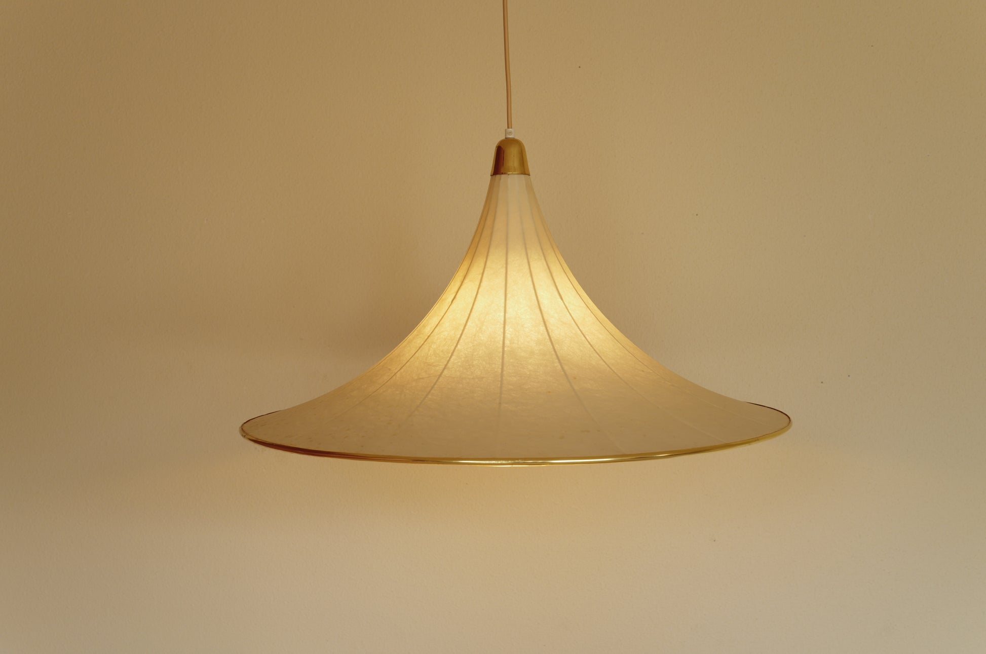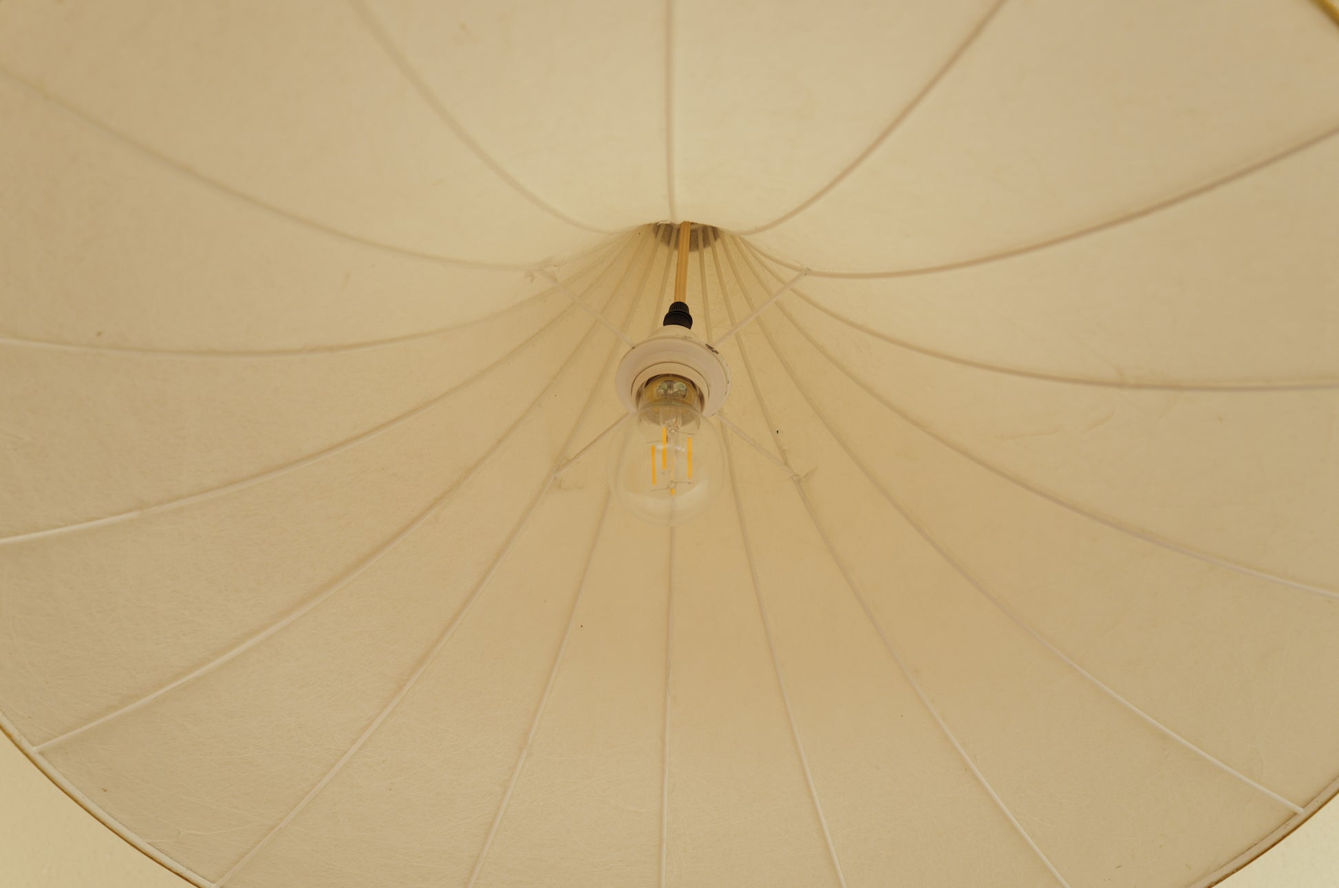 1960sに制作されたトランペットデザインのコクーンランプ。最大直径70cmと非常に大きな作品になりますがデザインの美しさとコクーンシェードの柔らかさが圧迫感を感じさせない、とても魅力的な作品になります。状態はシェードの一部に目立たない程度のシミがございますが全体的に良い状態を保っていると思われます。