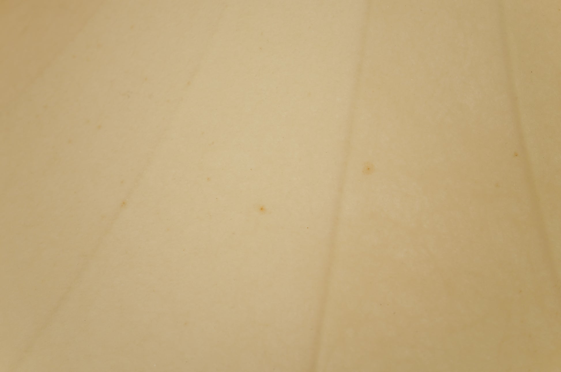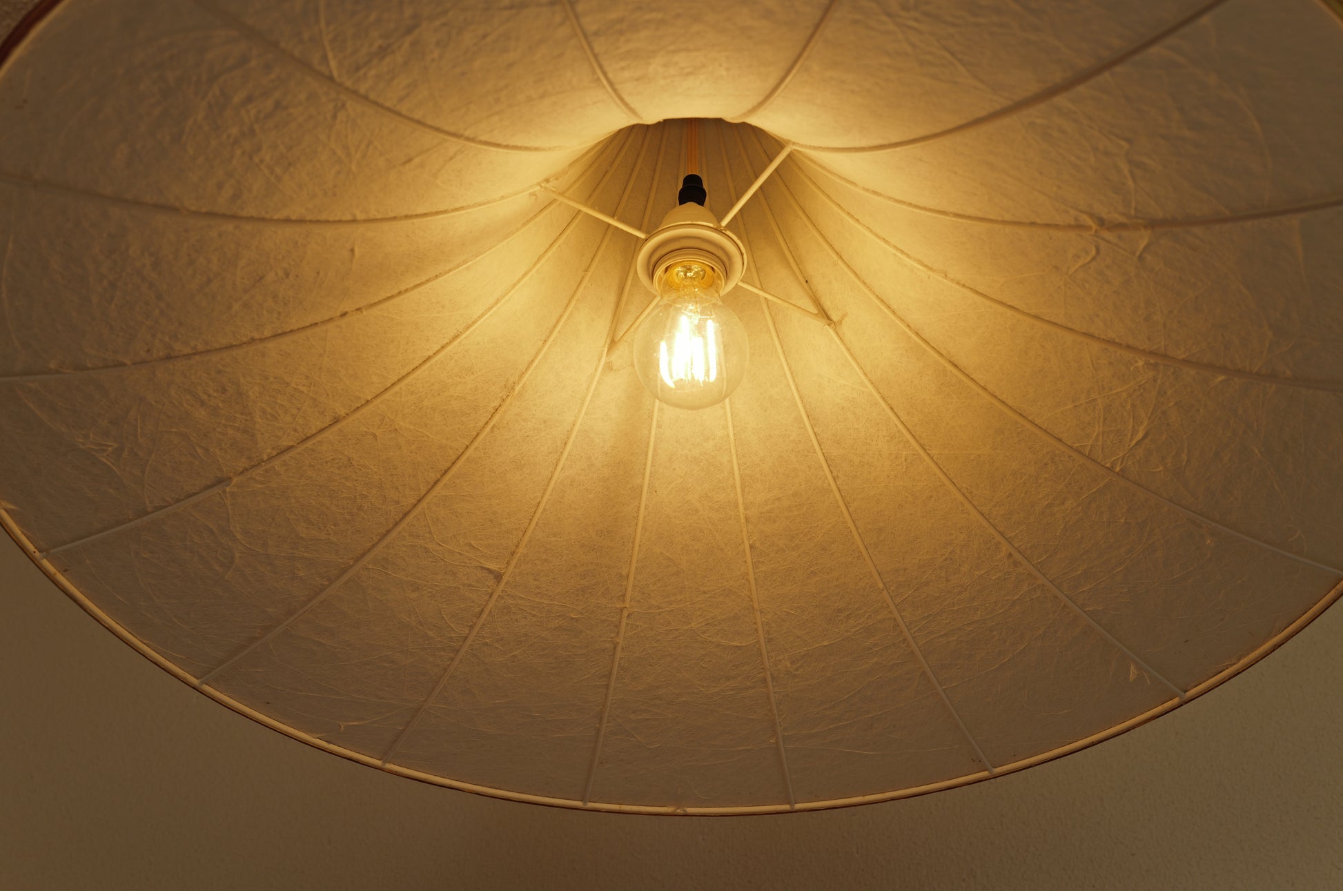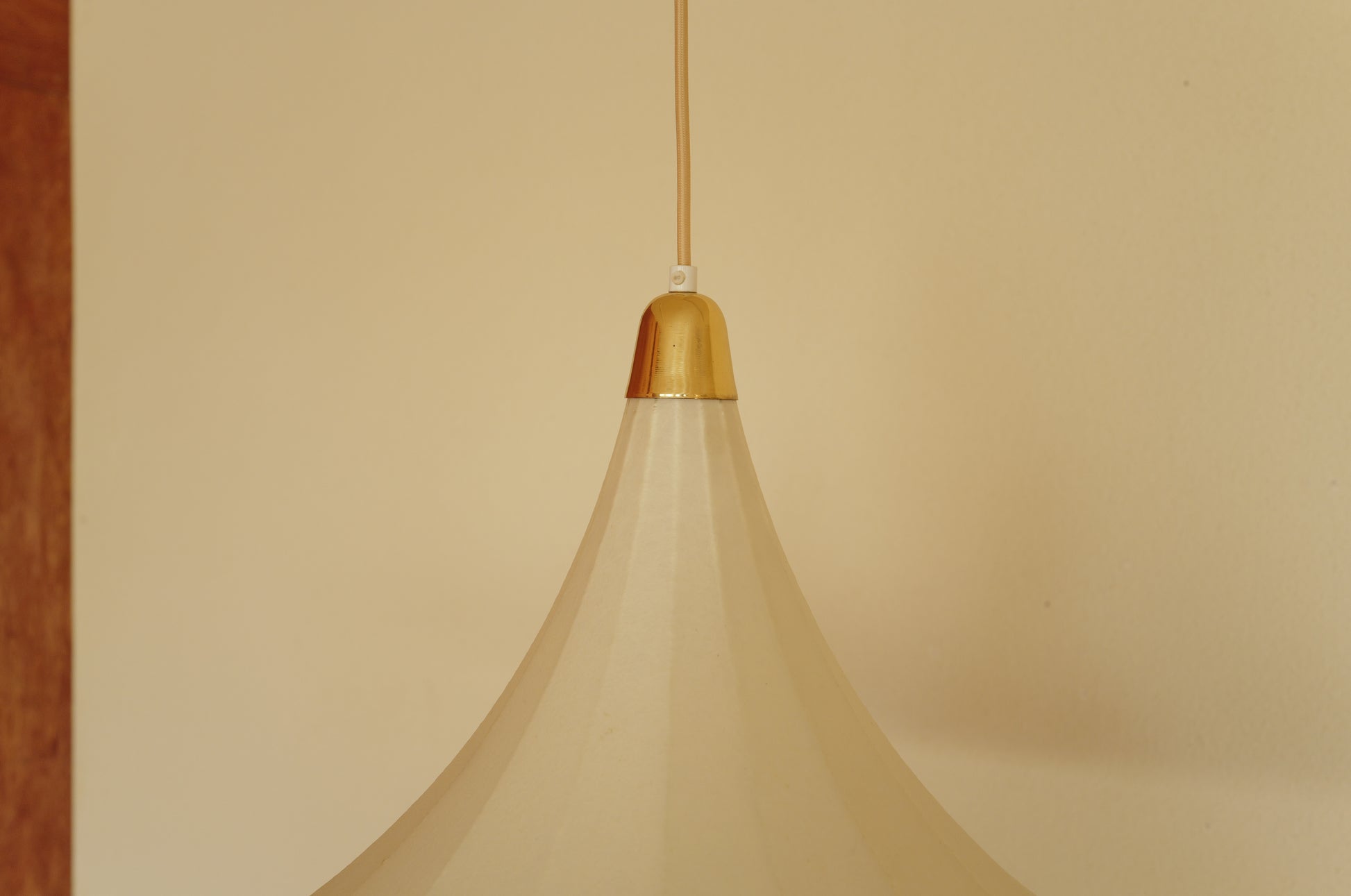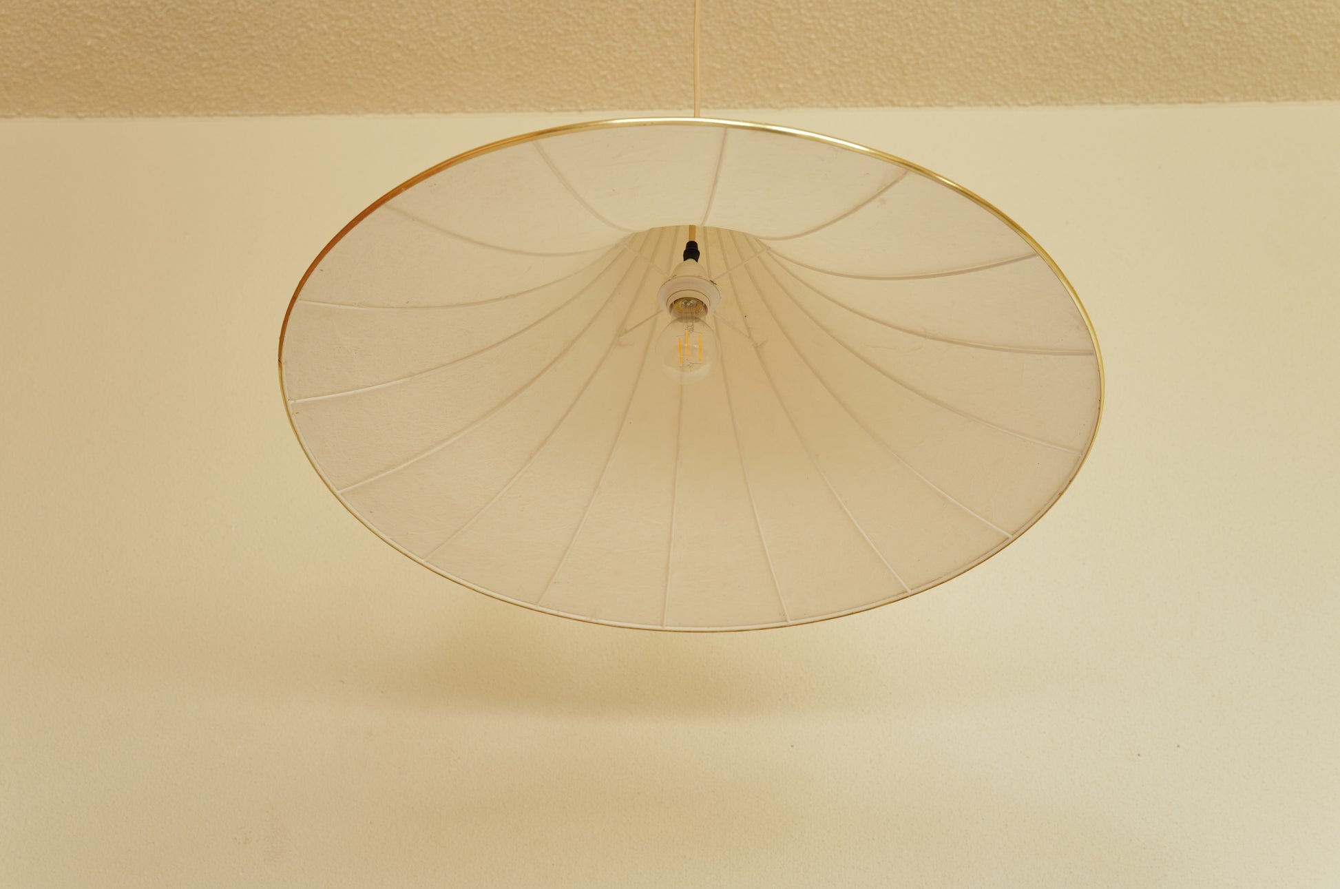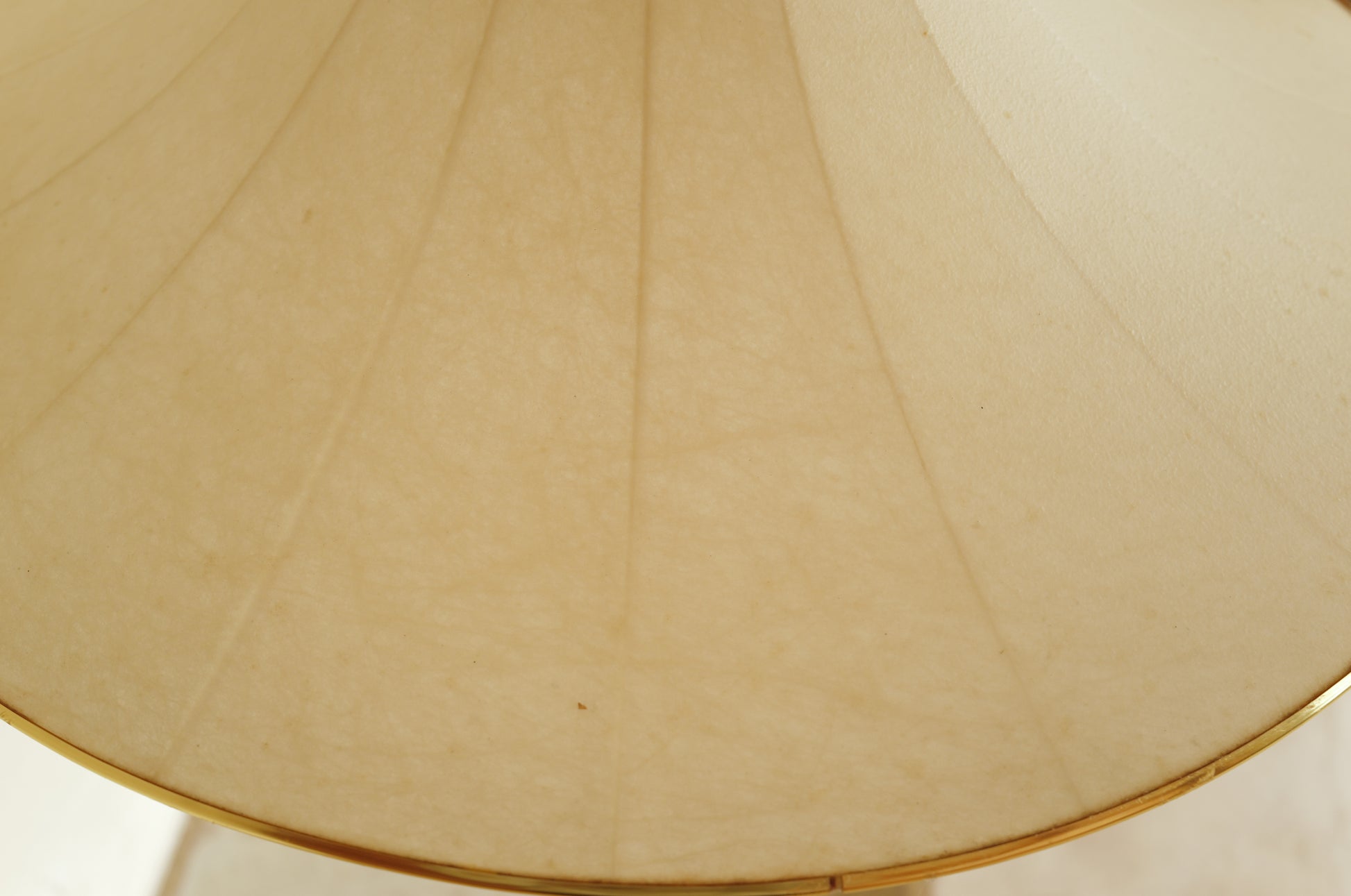 1960sに制作されたトランペットデザインのコクーンランプ。最大直径70cmと非常に大きな作品になりますがデザインの美しさとコクーンシェードの柔らかさが圧迫感を感じさせない、とても魅力的な作品になります。状態はシェードの一部に目立たない程度のシミがございますが全体的に良い状態を保っていると思われます。